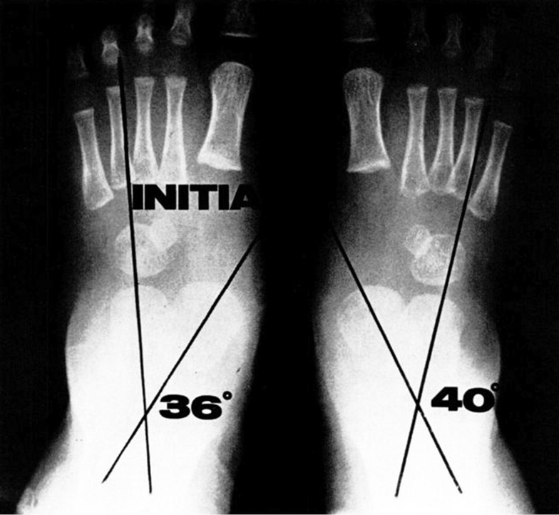 Рис. 3-B. Типичный пациент. Исходная рентгенография стоп в положении «стоя», переднезадняя проекция: таранно-пяточный угол — справа 40°, слева 36°