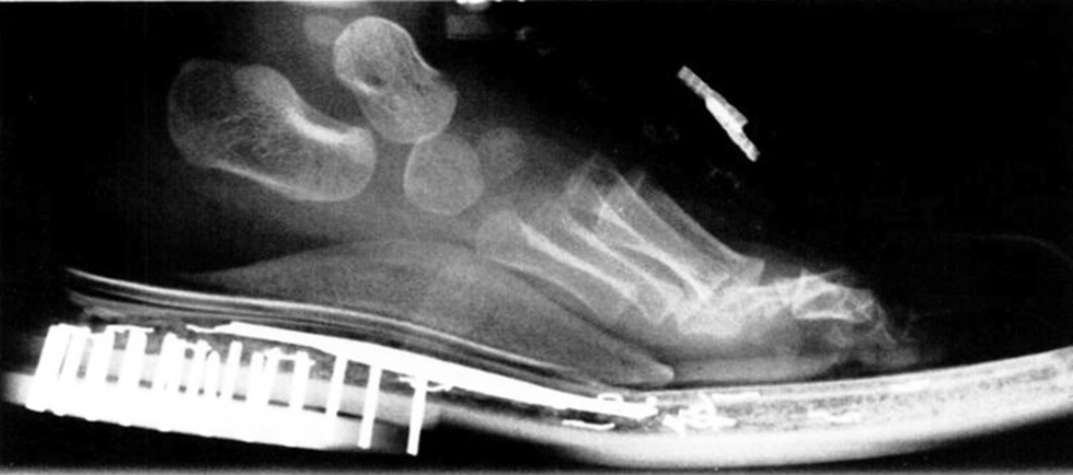 Контрольные рентгенограммы стоп в переднезадней и боковой проекциях в положении стоя в обуви и без обуви выполняли каждые 6 мес. (рис. 4). Пациентов также фотографировали один раз в 6 мес.