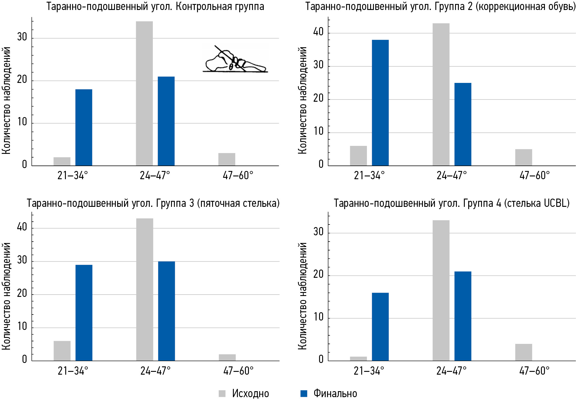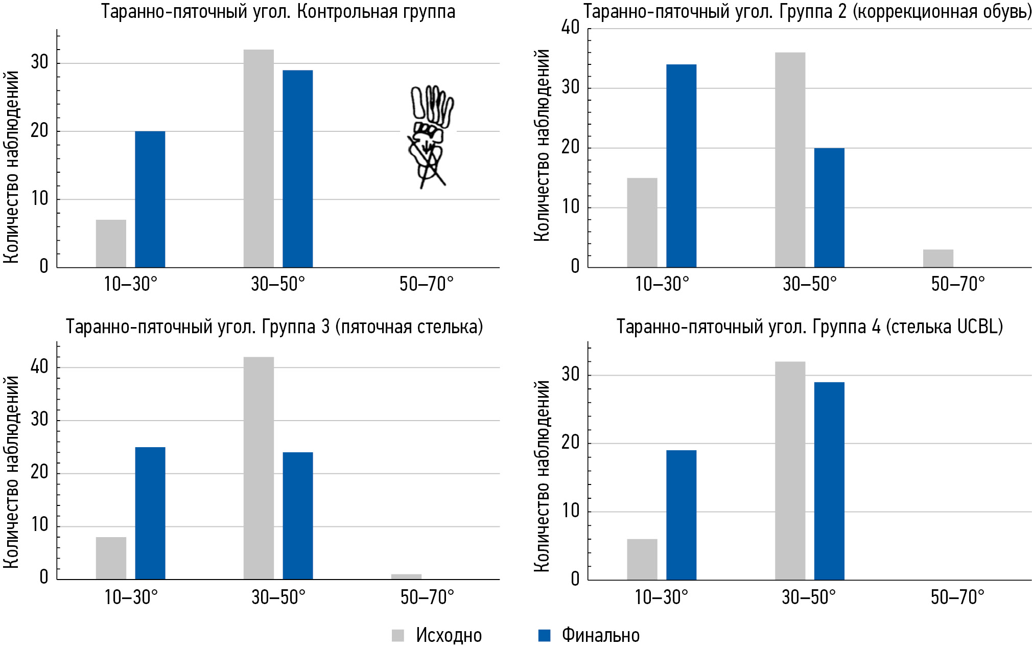 Рис. 5. Гистограммы отражают выраженность плоскостопия в каждой группе на основании измерения таранно-подошвенного угла в боковой проекции исходно и при финальном осмотре. UCBL (University of California Biomechanics Laboratory) — Биомеханичеcкая лаборатория Калифорнийского университета