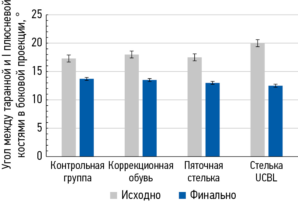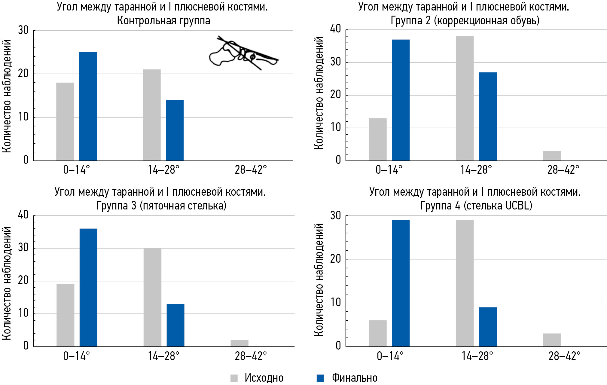 Рис. 6. Гистограммы показывают выраженность плоскостопия в каждой группе на основании измерения угла между таранной и I плюсневой костями в боковой проекции исходно и при финальном осмотре. UCBL (University of California Biomechanics Laboratory) — Биомеханичеcкая лаборатория Калифорнийского университета