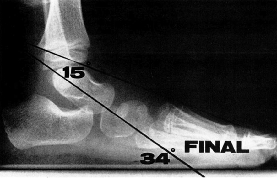 Рис. 8. Рентгенография стопы (того же пациента, что и на рис. 3 и 4) в положении стоя без коррекционной обуви по истечении трех лет лечения. Боковая проекция: таранно-подошвенный угол уменьшился до 34°, а угол между таранной и I плюсневой костями — до 15°