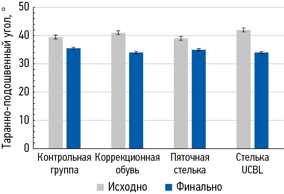 Рис. 9. Сравнение исходных и финальных значений таранно-подошвенного угла. Значимых различий в четырех группах (р > 0,4) не отмечено. Гистограммы демонстрируют среднее значение и стандартную ошибку. UCBL (University of California Biomechanics Laboratory) — Биомеханичеcкая лаборатория Калифорнийского университета