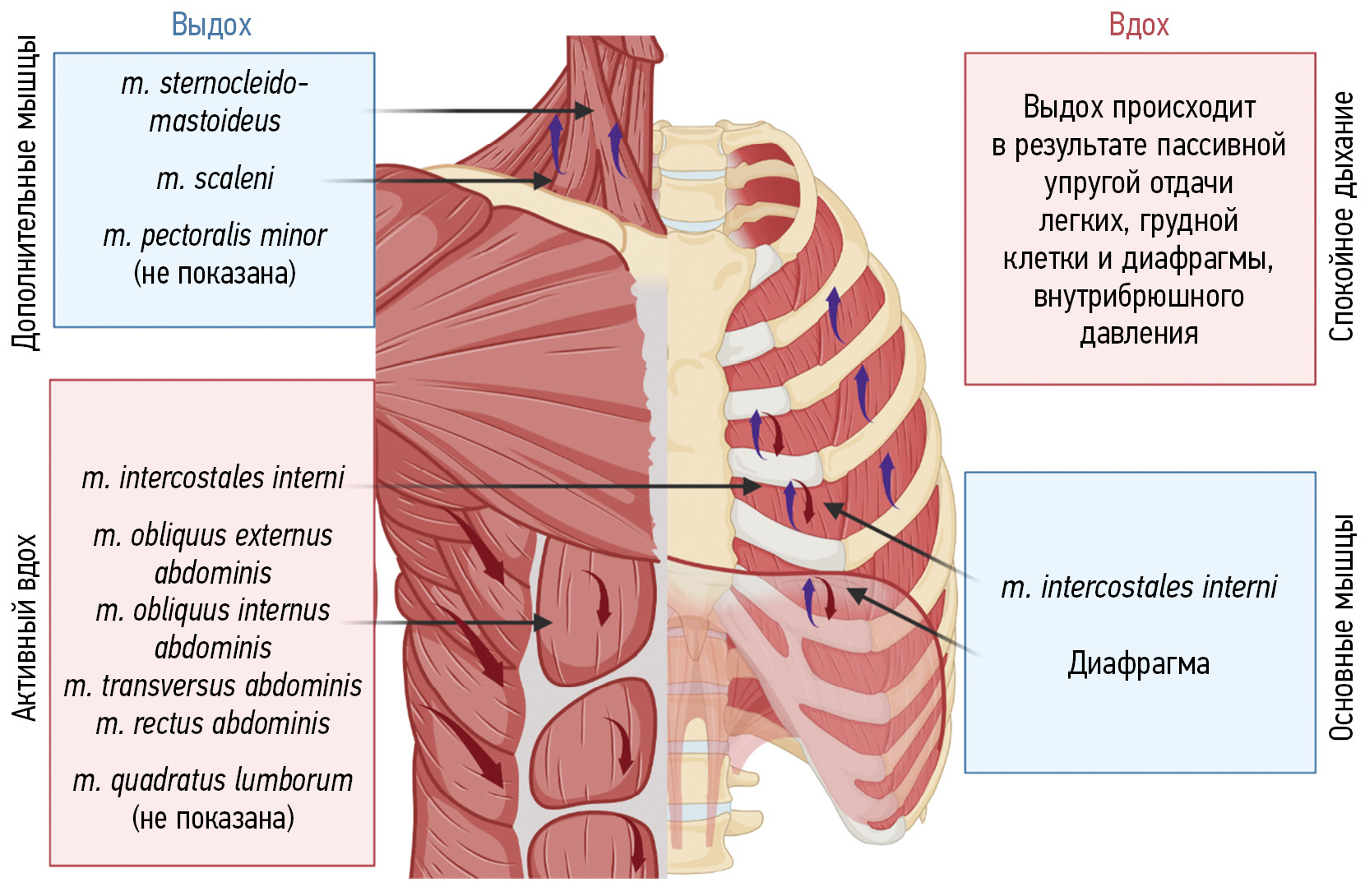 Рис. 1. Анатомия основных и вспомогательных дыхательных мышц