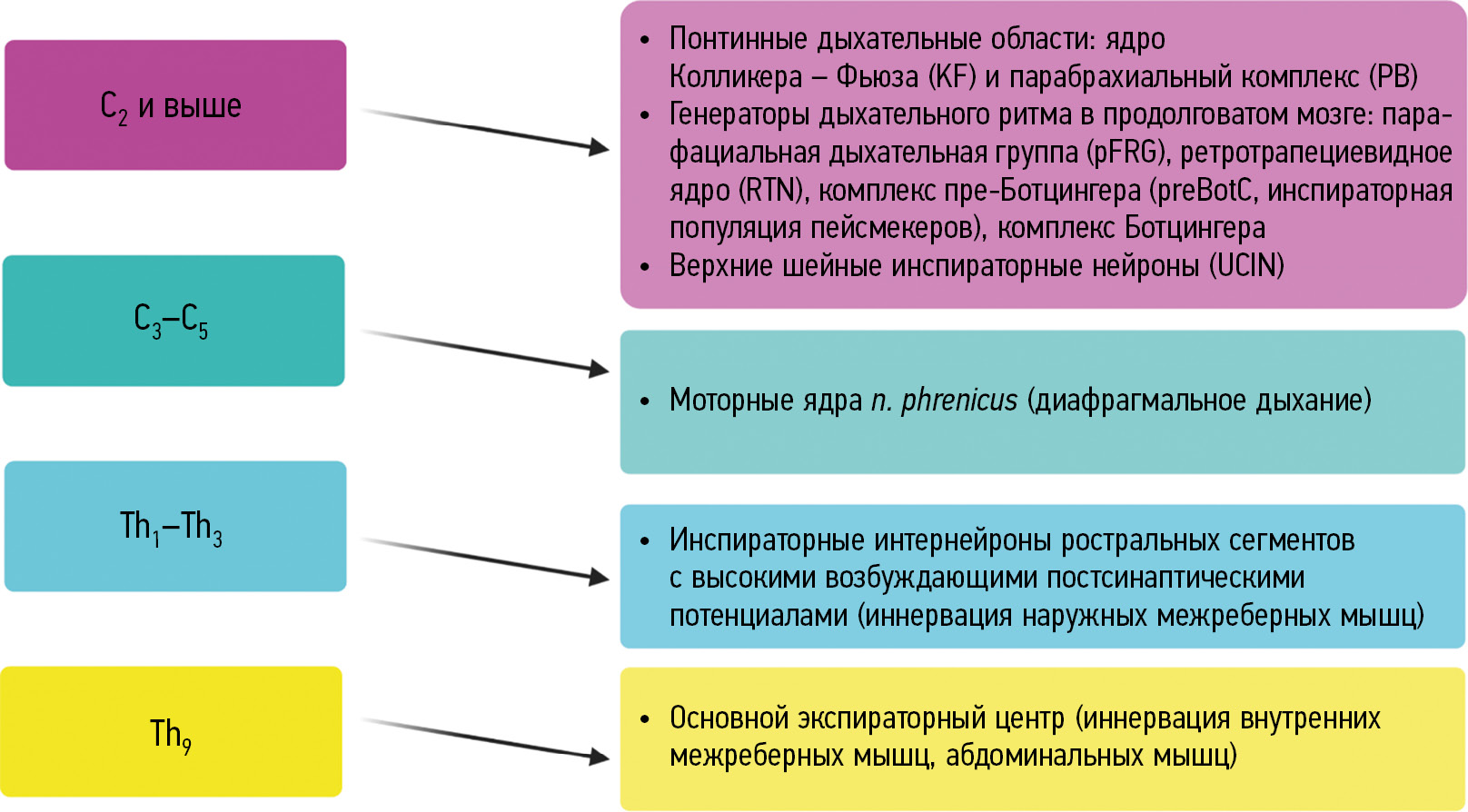 Последние данные свидетельствуют о наличии двух основных генераторов дыхательного ритма: парафациальной дыхательной группы (pFRG) и комплекса пре-Ботцингера (preBotC, инспираторная популяция пейсмекеров). Инспираторная и экспираторная активность, осуществляемая в этих медуллярных генераторах дыхательных ритмов, модулируется из различных участков нижней части ствола мозга, включая мост и комплекс Ботцингера, и затем выводится в виде активности мотонейронов через эфферентные сети в стволе мозга и спинном мозге (рис. 2) [10, 11].