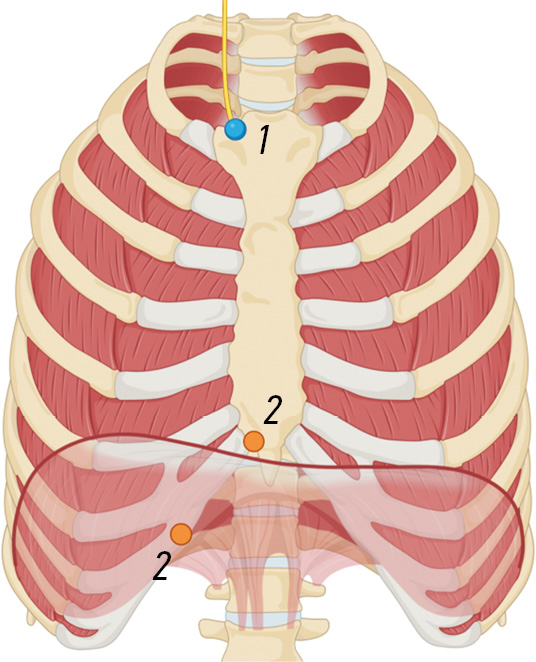 Травма на уровне Th1–Th3. По данным исследований, многие грудные интернейроны обладают дыхательной активностью [30]. При этом инспираторных интернейронов больше в более ростральных грудных сегментах, тогда как инспираторных возбуждающих постсинаптических потенциалов больше в интернейронах, расположенных в более ростральных сегментах, в основном в сегментах Th1–Th3 [31].