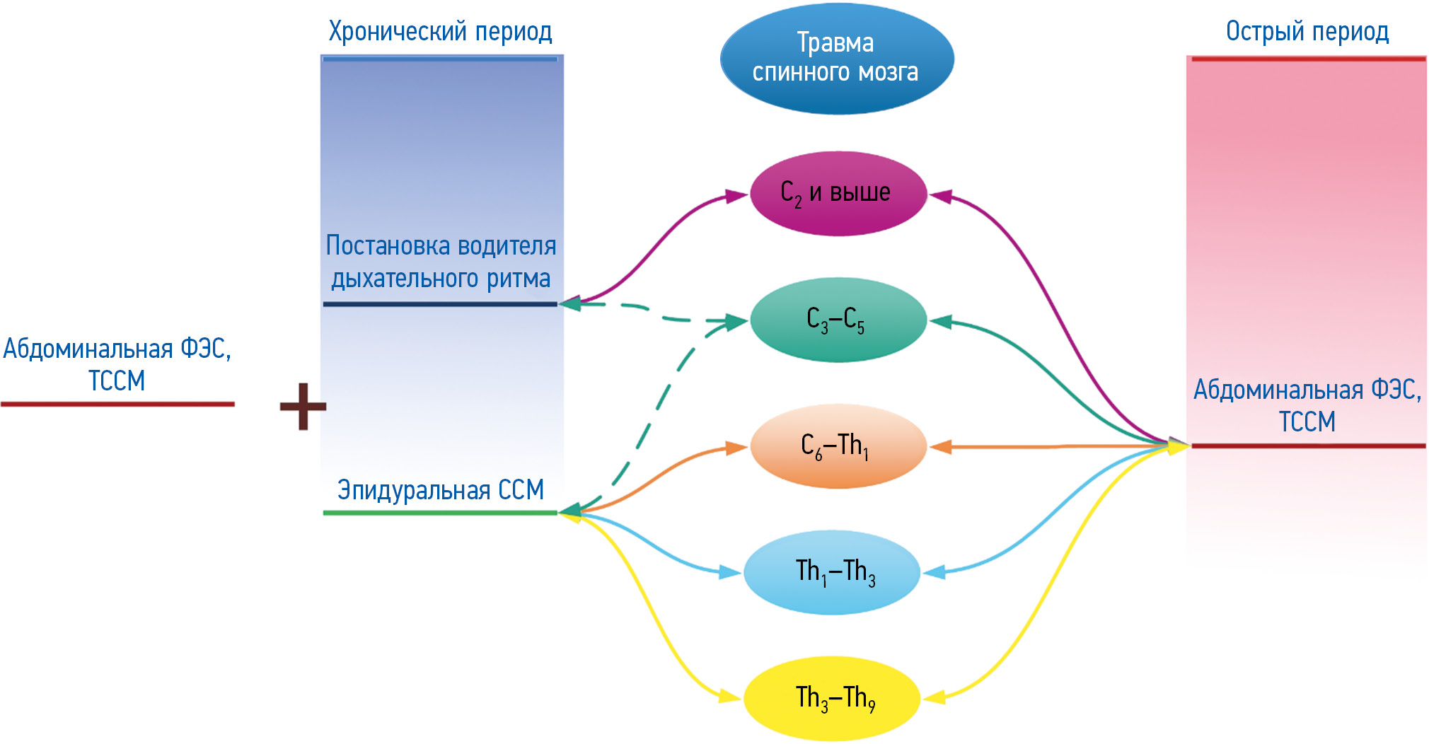 Рис. 5. Алгоритм применения методик электростимуляции для коррекции и ускоренного восстановления дыхательных расстройств при травме спинного мозга. ФЭС — функциональная электростимуляция; ТССМ — транскутанная стимуляция спинного мозга; ССМ — стимуляция спинного мозга
