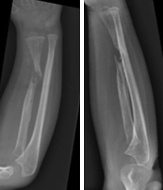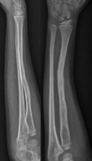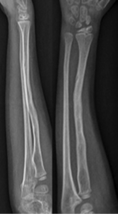 2014年12月,1例4岁男孩右前臂意外受伤后在急诊室就诊,右前臂显示畸形、疼痛和功能丧失,没有伤口或神经血管缺损。诊断为右桡骨骨干远端骨折。骨折患肢用石膏固定。2015年1月,固定部位的原骨干骨折复位处出现裂缝,拆除石膏。一个月后,患肢发生新的低能量创伤,患者再次到急诊室就诊,诊断为复发性骨折、右桡骨远端三分之一处移位骨折(图1)。