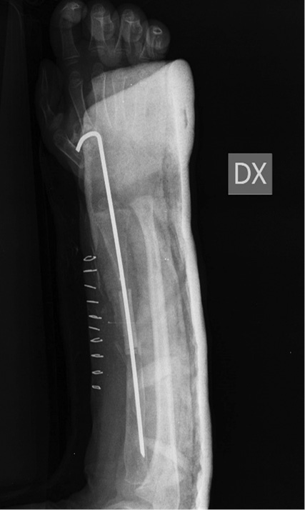 根据两个不同的意大利研究中心进行的骨活检,结果显示Gorham-Stout综合症阴性:显示反应性骨组织血管异常、坏死性骨软骨碎片、巨大的单核细胞。患者将这些结果提交给我们医院,我们决定再次进行活检,并确认排除Gorham-Stout综合症。之后,进行了更多的实验室测试,并征求了更多专家的意见,以排除可能导致大片骨溶解的所有原因。从最后一次骨折开始的11个月后,我们在骨折部位进行了一次新的手术,切除了病灶组织并植入了具有髓样生长因子的自体腓骨同种异体移植骨,并用Kirschner钢针(克氏针)固定(图4)。