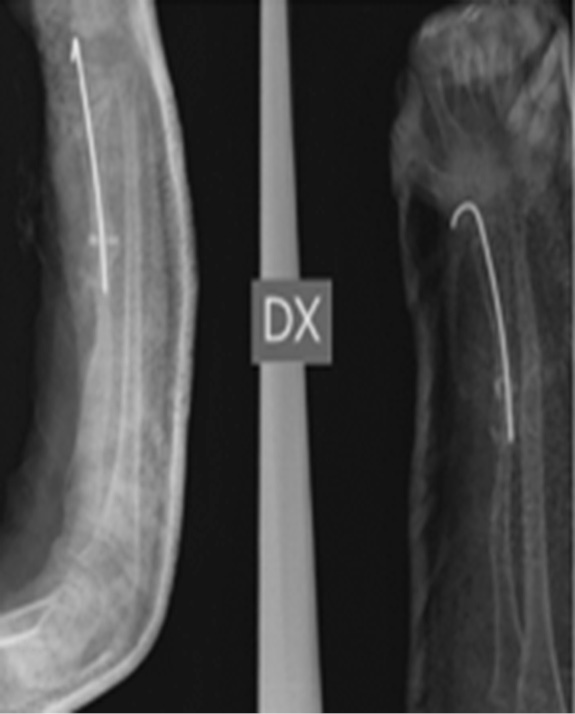 在手术室用Kirshner钢针(克氏针)固定了骨折,但在术中有医源性纵向骨折的并发症,该并发症由钢丝环扎加固法引起。手术约3个月后,即便X光片显示骨折处愈合还很轻微,也去除了Kirshner钢针和环扎钢丝,并用新的石膏固定前臂(图2)。