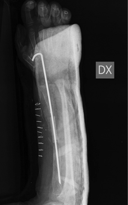 Была выполнена биопсия кости, и по заключению двух разных итальянских центров синдром Горхема – Стоута был исключен, так как выявлены реактивная костная ткань с аномальной васкуляризацией, некротические костно-хрящевые фрагменты и гигантские мононуклеарные клетки. Несмотря на то что пациент поступил в нашу больницу с этими результатами, было решено повторить биопсию, и исключение синдрома Горхема – Стоута было подтверждено. После этого провели дополнительные лабораторные исследования и консультации с большим количеством специалистов, чтобы исключить все причины, которые могли привести к обширному остеолизу. Спустя 11 мес. после последней травмы произведена новая операция на месте перелома с иссечением ткани и имплантированием аутологичного трансплантата малоберцовой кости с факторами роста костного мозга. Трансплантат стабилизирован спицами Киршнера (рис. 4).