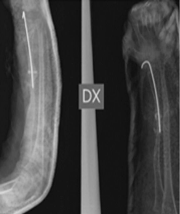 При хирургическом лечении были использованы спицы Киршнера, но во время операции произошло осложнение в виде ятрогенного продольного перелома, который был синтезирован проволочным серкляжем. Примерно через 3 мес. после операции, хотя на рентгенограмме были незначительные признаки консолидации кости, металл был удален и предплечье было иммобилизовано новой повязкой (рис. 2).