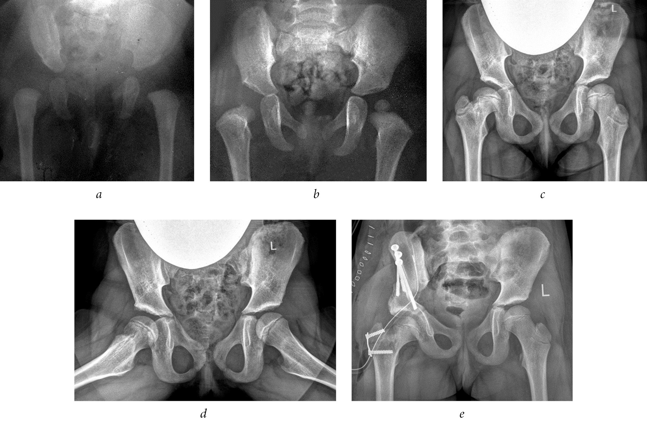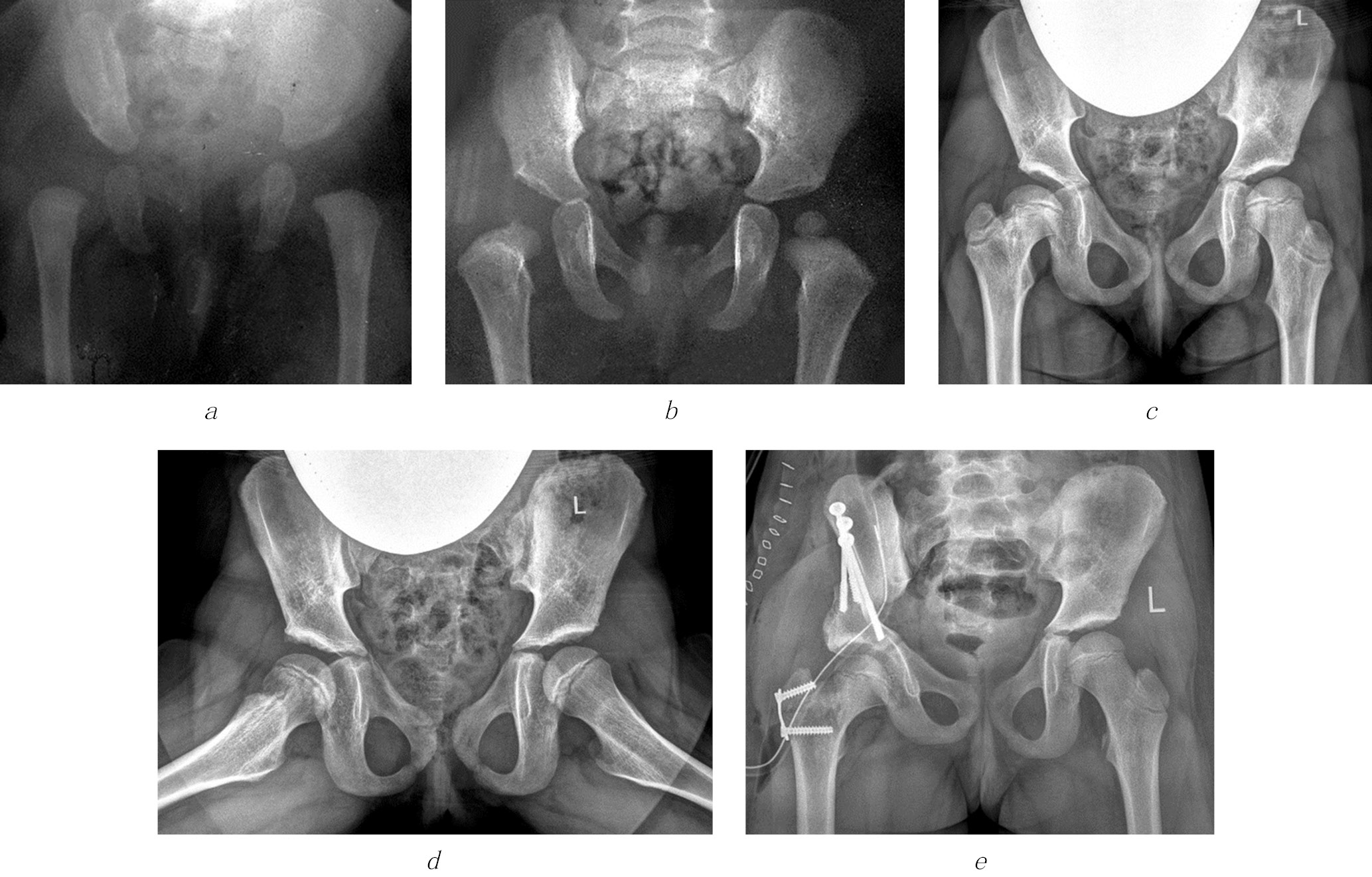 Fig. 1. Radiographs of patient U (7 years old) diagnosed with congenital dislocation of the right hip, condition after conservative treatment, and residual developmental hip dysplasia. Complications of aseptic necrosis of the femoral head include femoral neck shortening, formation of Kalamchi type II deformity, and high position of the greater trochanter: a, at 4 months old; b, at 1 year old; c, d, at 7 years old, before surgery; e, immediately after iliac pelvic osteotomy and trochanteric epiphysiodesis on the right