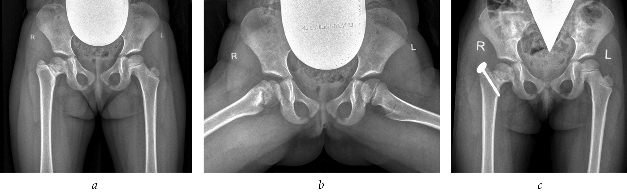 Fig. 2. Radiographs of patient G (4 years old) diagnosed with complications of septic arthritis of the hip joint, emerging high position of the greater trochanter on the right, and multiplanar deformity of the femoral neck with eccentric growth of the epiphysis posteriorly: a, b, before surgery; c, immediately after trochanteric epiphysiodesis on the right