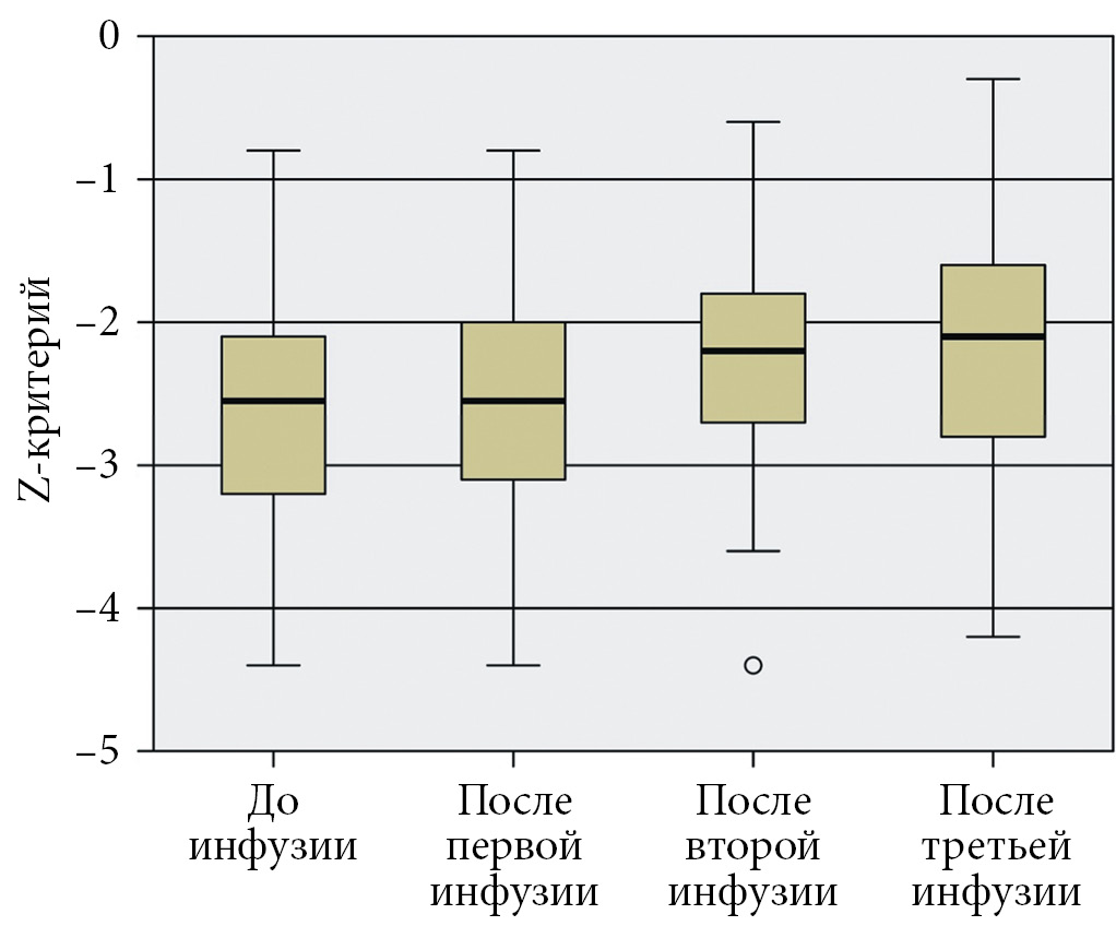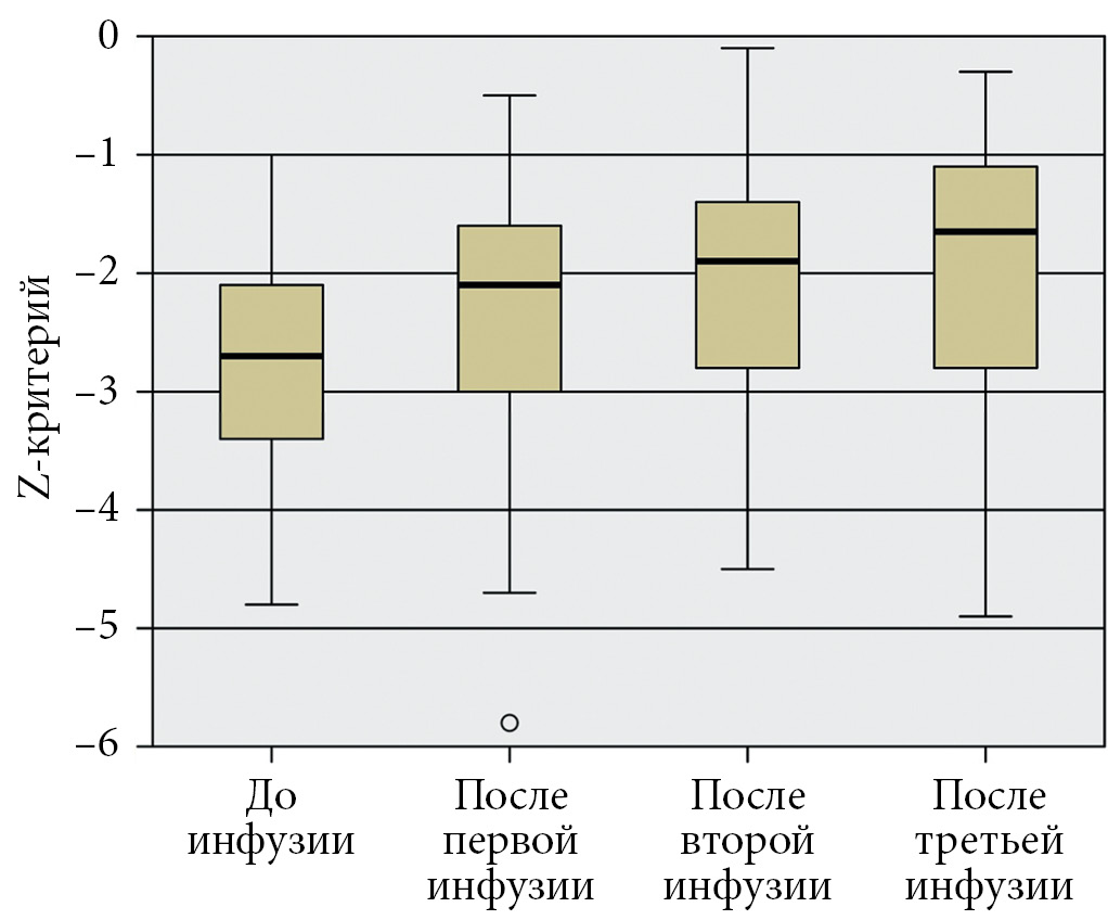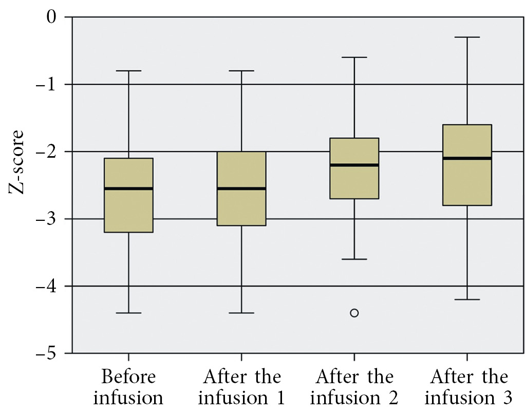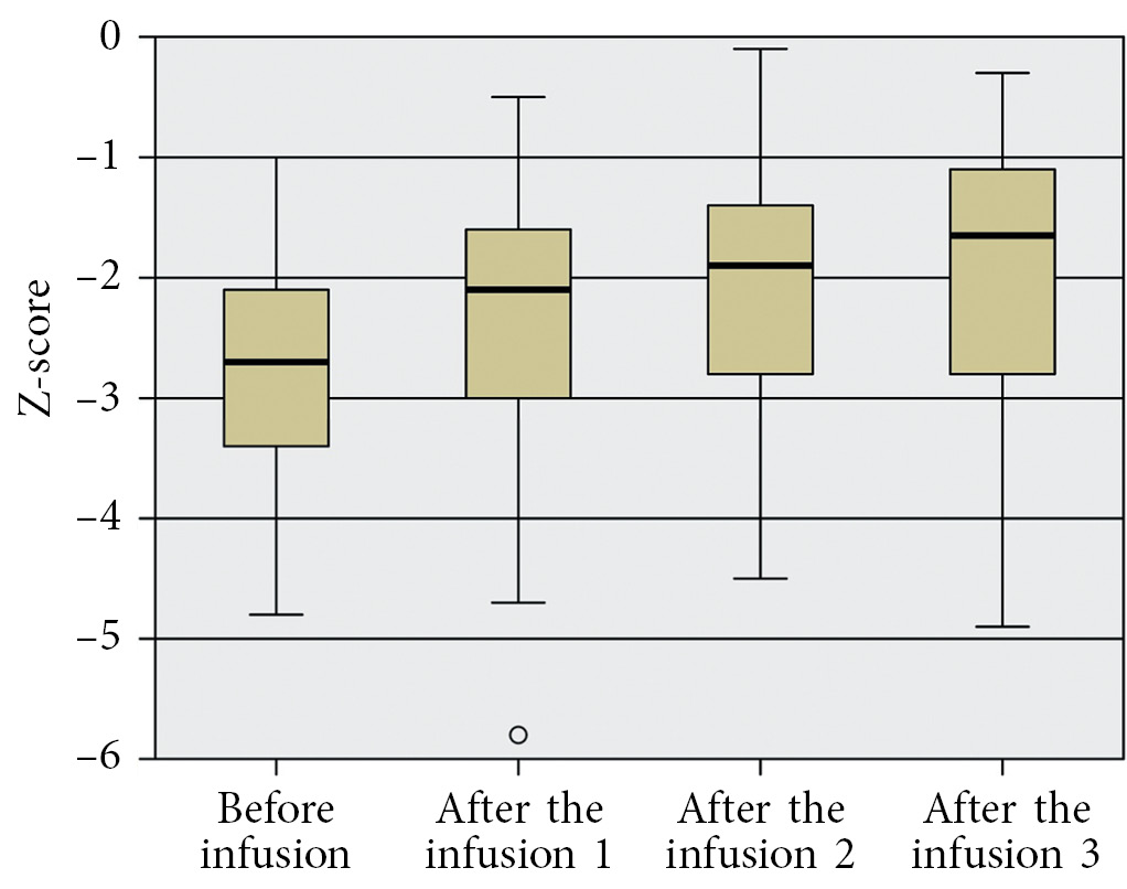 结果。全身Z标准平均值从-2.55增加到-2.1,腰椎z标准平均值从-2.7增加到-1.65。腰椎区域的Z标准在第一次灌注后得到改善,在前两次灌注后得到全身Z标准的改善。