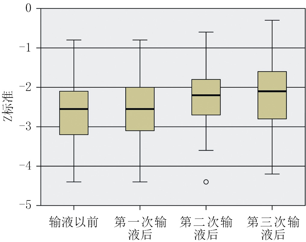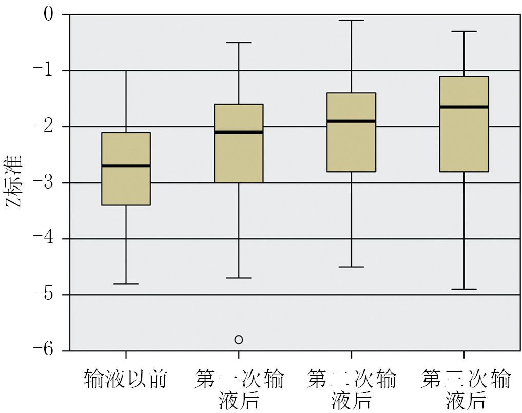 腰椎区域该指标的中位数已达到-1.9,即正常界限,第三次输液后该指标有所改善。