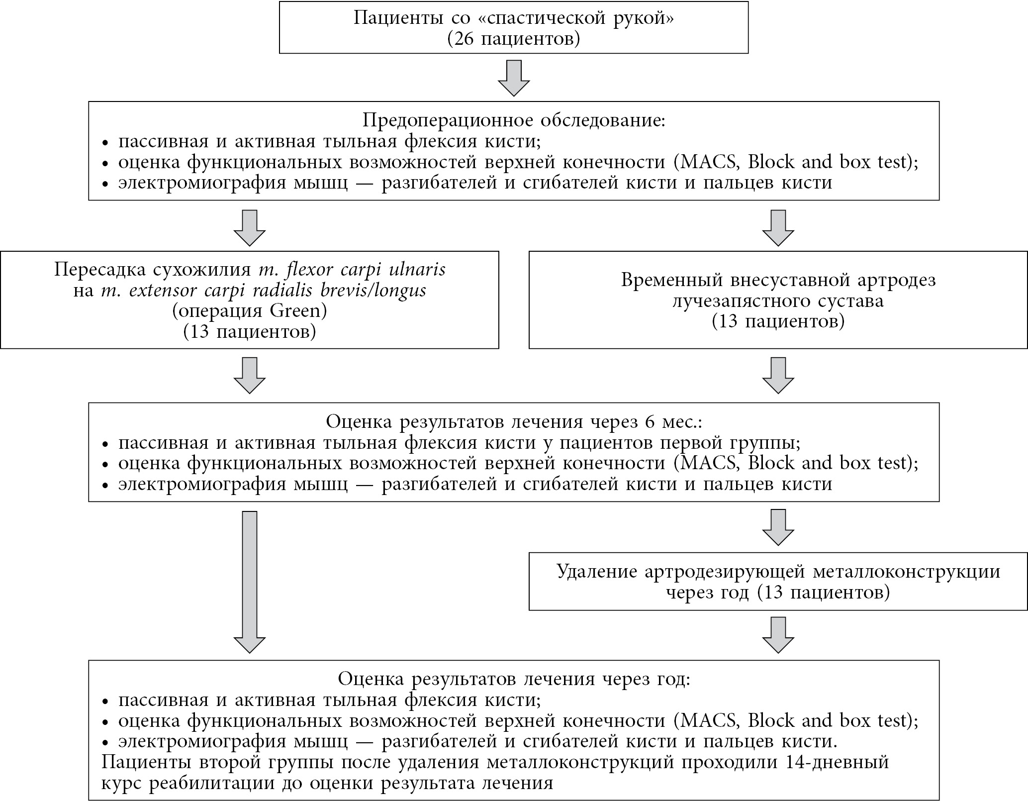 Исследование основано на анализе результатов обследования и лечения 26 пациентов с ДЦП в ФГБУ «НМИЦ ДТО им. Г.И. Турнера» Минздрава России. Пациенты были разделены на две группы. Первая (архивная) группа состояла из 13 пациентов, проходивших лечение в нашей клинике с 2011 по 2018 г. [11]. Этим больным выполняли пересадку сухожилия m. flexor carpi ulnaris на m. extensor carpi radialis brevis/longus (операция Green). Пациенты второй группы (13 детей) проходили обследование и получали лечение с 2018 по 2020 г. Им выполняли временный внесуставной артродез лучезапястного сустава.