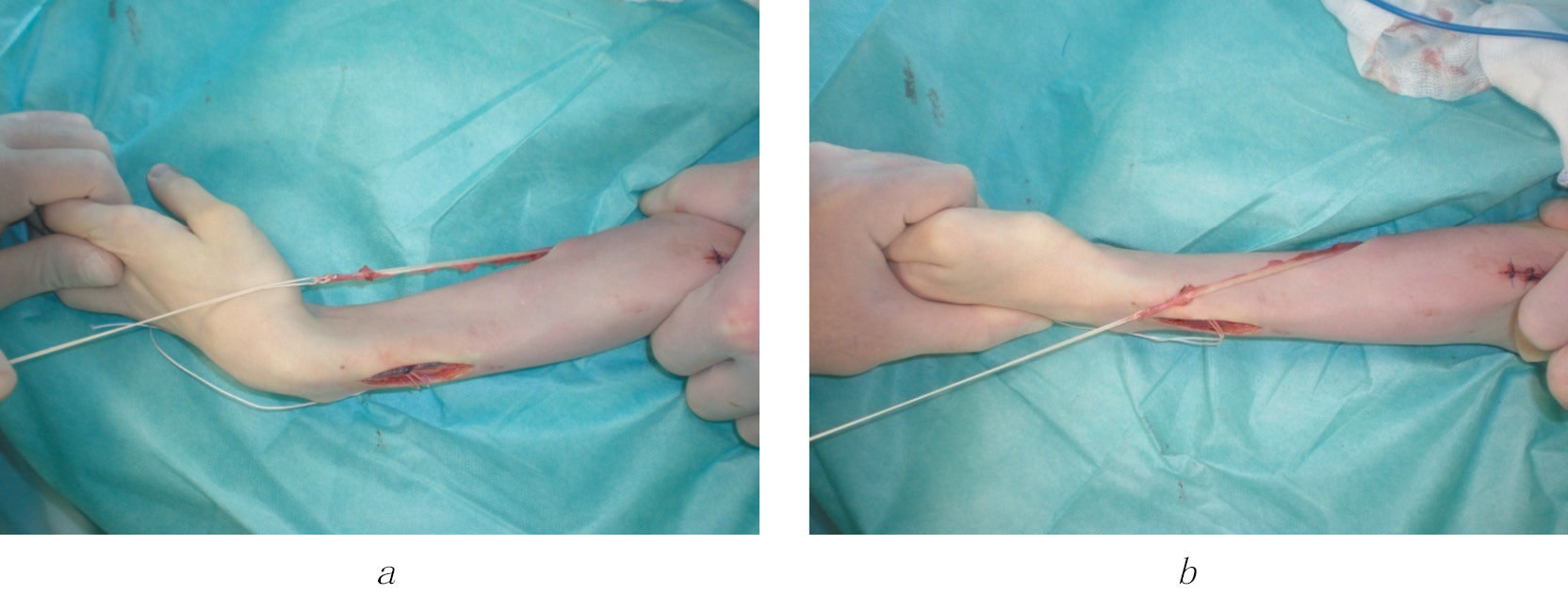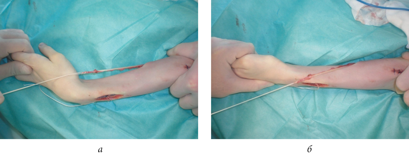 Рис. 2. Хирургические этапы транспозиции m. flexor carpi ulnaris из положения сгибателя кисти в положение разгибателя: а — отсеченное от места прикрепления и мобилизованное сухожилье m. flexor carpi ulnaris; б — место прикрепления на тыльной поверхности предплечья сухожилия m. flexor carpi ulnaris к сухожилиям m. extensor carpi radialis brevis и longus
