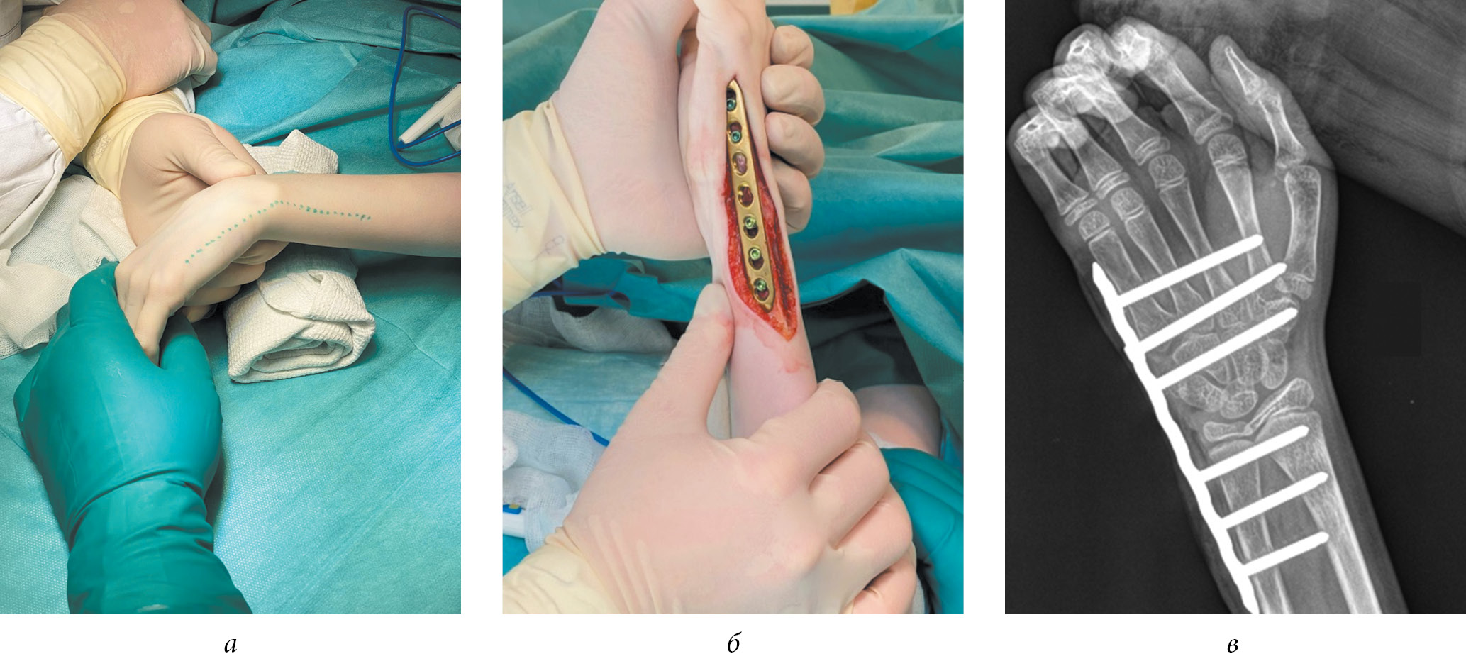 Рис. 3. Хирургические этапы временного артродеза лучезапястного сустава: а — планируемый операционный доступ; б — установленная металлоконструкция для временного артродеза; в — рентгенограмма лучезапястного сустава в прямой проекции с установленной металлоконструкцией