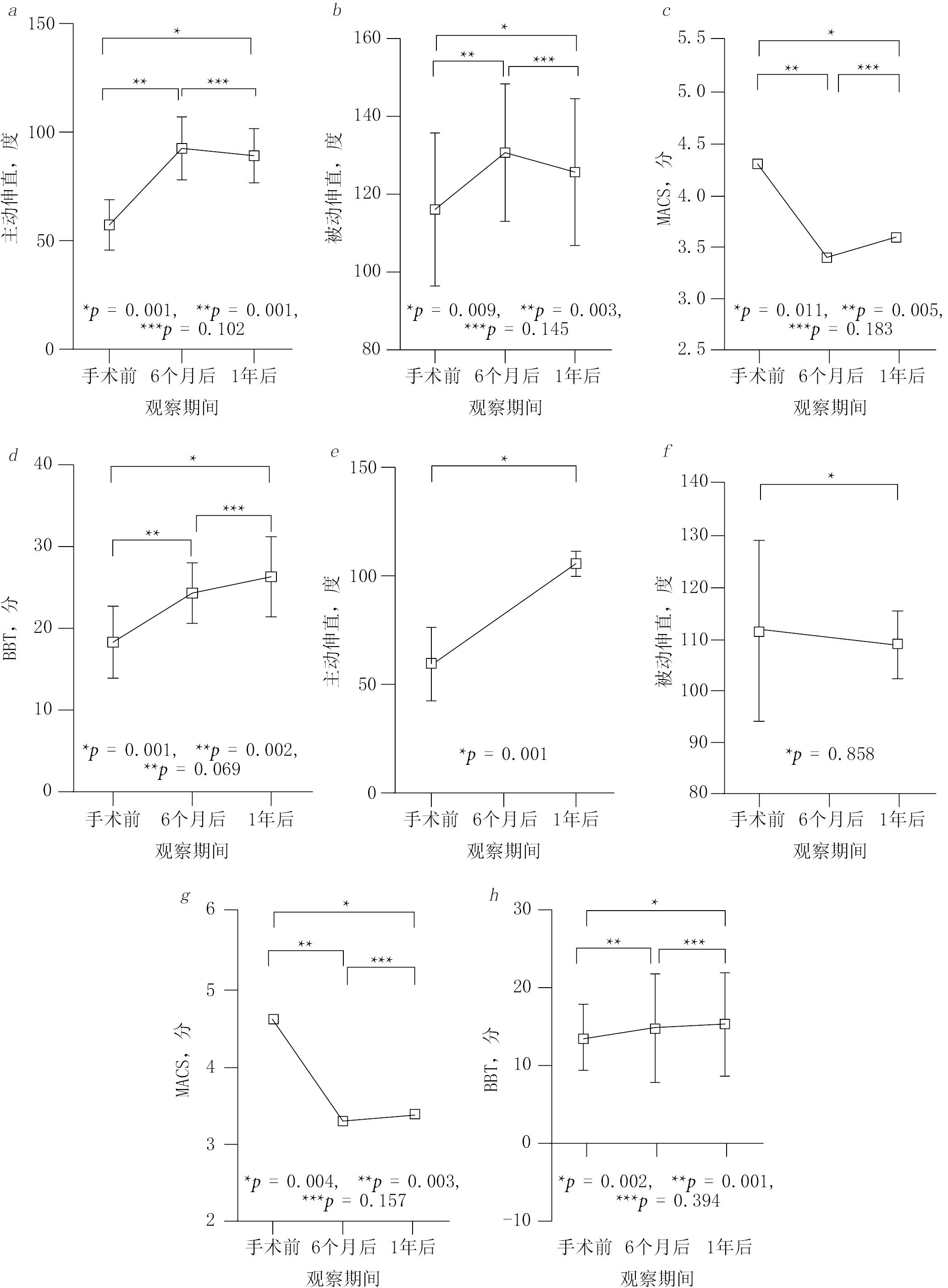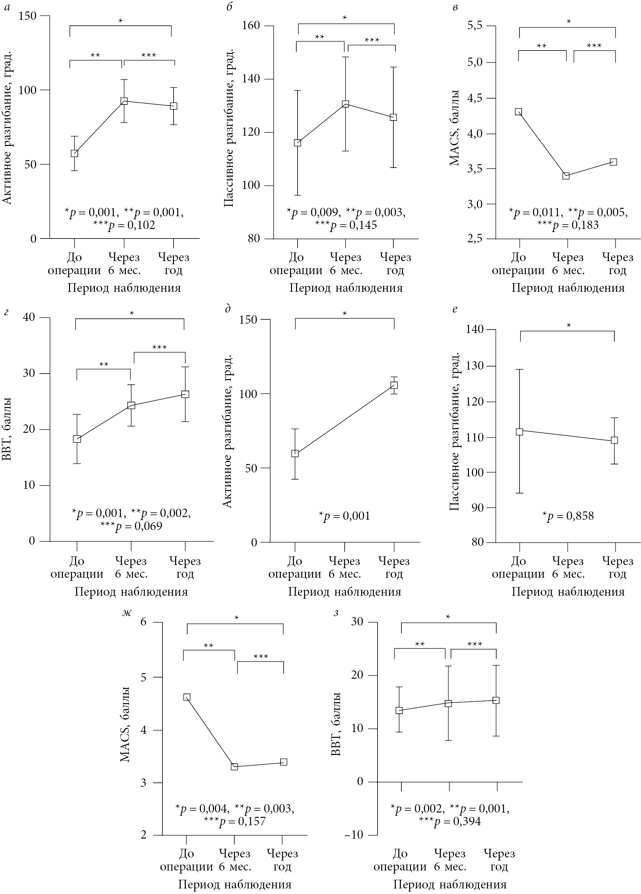 Рис. 4. Динамика показателей активного и пассивного разгибания в лучезапястном суставе, функциональной оценки по шкале MACS и Block and Box test (BBT): а–г — в первой группе; д–з — во второй группе