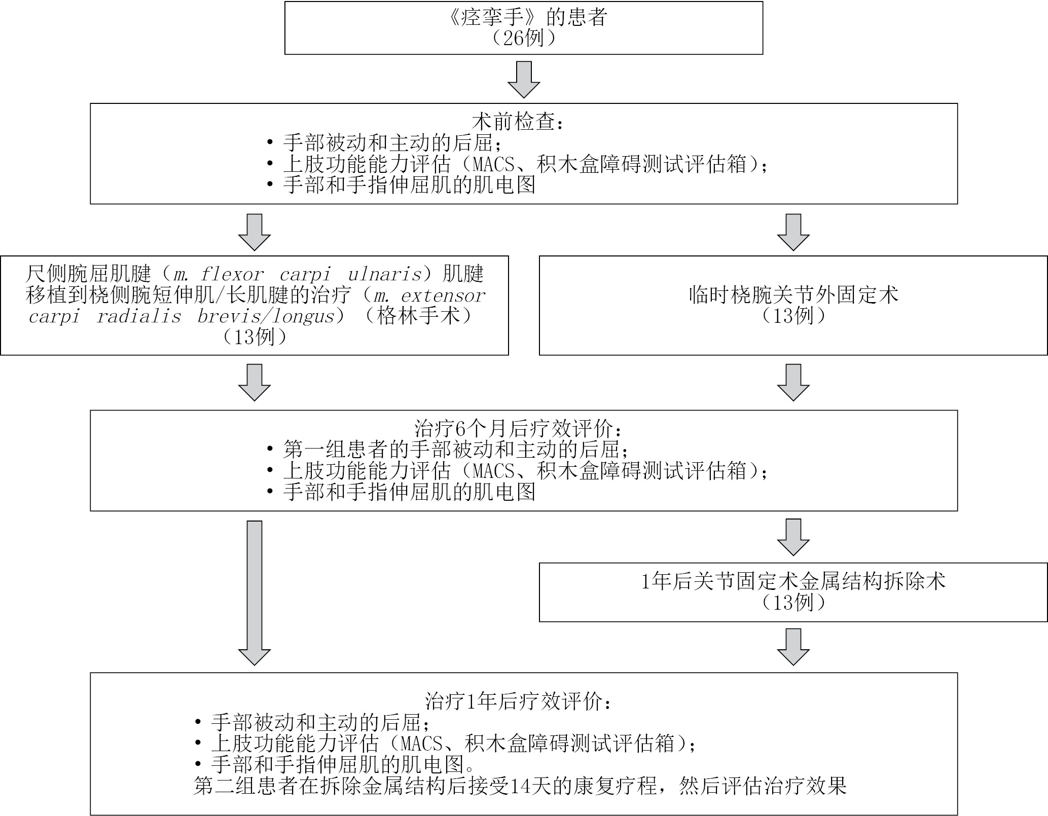 Отсутствие произвольных движений верхней конечности, как и выраженная умственная отсталость или отсутствие мотивации к прохождению послеоперационной реабилитации, являлись критериями исключения из исследования.