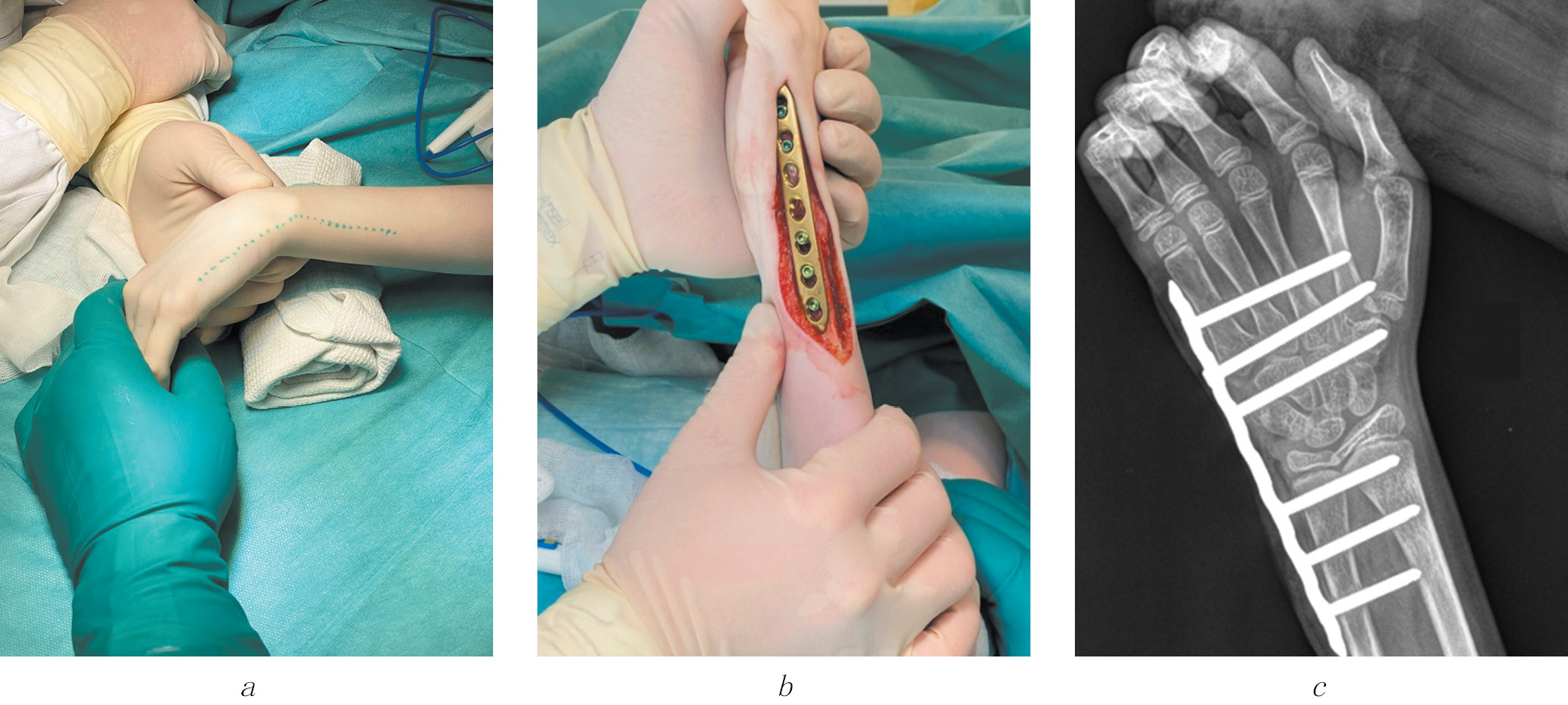 Оперативное вмешательство пациентам второй группы выполняли следующим образом (рис. 3). Из продольного разреза по локтевой поверхности предплечья и кисти от середины V пястной кости до границы нижней и средней третей предплечья накостно устанавливали пластину с угловой стабильностью, которую фиксировали винтами, проводившимися через локтевую, лучевую кости, кости запястья и метадиафизарную область V, ΙV, ΙΙΙ и II пястных костей. Кисть стабилизировали в среднем положении или в положении физиологического разгибания в лучезапястном суставе (100°). Предплечье фиксировали при среднем ротационном положении. Конечность иммобилизировали короткой гипсовой лонгетой или тутором на 2–3 дня до исчезновения болевого синдрома. В дальнейшем ортезирование не применяли.