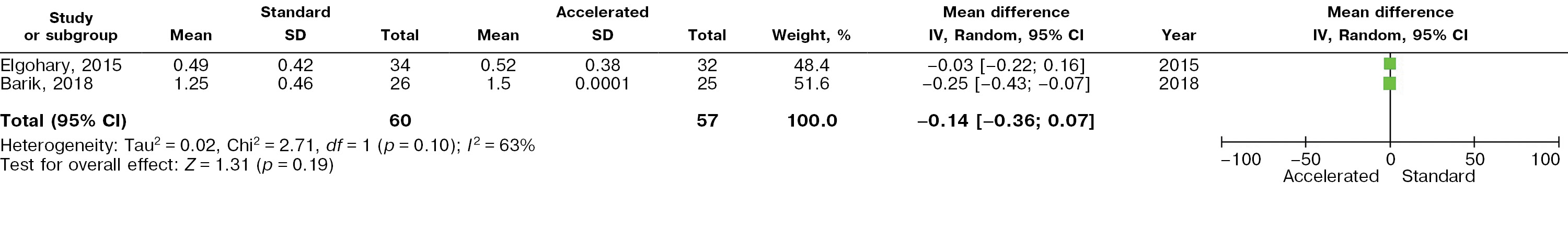 The Pirani scoring system is one of the most commonly used methods for assessing deformity severity in clubfoot. It includes six components: posterior crease, emptiness of the heel, equinus rigidity, medial crease, curvature of the lateral border of the foot, and the reducibility of the lateral talar head. Each item is given a score of 0 for no abnormality, 0.5 for moderate abnormality, or 1.0 for severe abnormality, and summed for a total score (Total Foot Score: TFS) of 0–6 points, where a higher score indicates severer deformity. Furthermore, TFS is divided into two subtotal scores (range: 0–3 pts), respectively representing contracture of the midfoot (Mid Foot Score: MFS) and hindfoot (Hind Foot Score: HFS). MFS is the sum of item scores for medial crease, lateral curvature and reducibility of talus, whereas HFS is the corresponding sum for posterior crease, empty heel and rigid equines [12, 13]. Based on this meta-analysis, we can conclude that accelerated Ponseti casting can achieve comparable Pirani scores — and therefore reductions in deformity severity — to standard Ponseti casting.