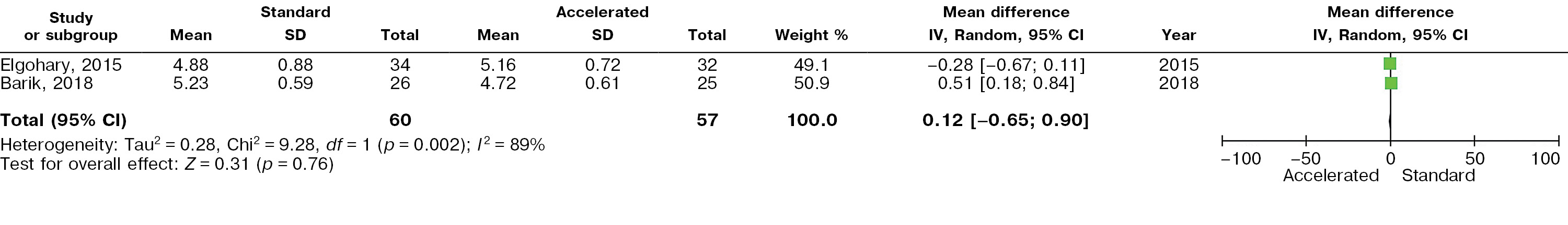 Elgohary et al., 2015 | Every week | Twice a week | 25.25 ± 8.67 (12–48 months) | 23.38 ± 9.21 (12–44 months) | 5.17 ± 0.62 | 5.13 ± 0.61 | 0.49 ± 0.42 (>12 months) | 0.52 ± 0.38 (>12 months) |