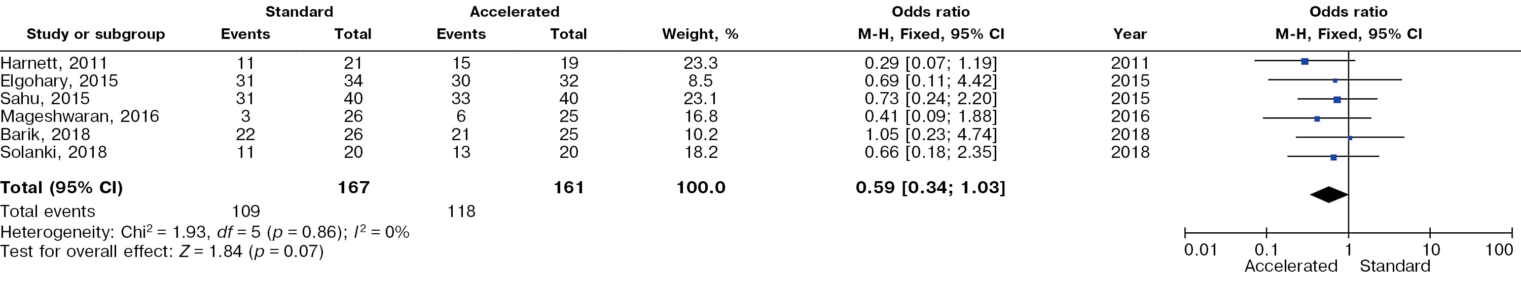 (1) To our knowledge, it is the first meta-analysis on the relative merits of the accelerated versus standard Ponseti method.