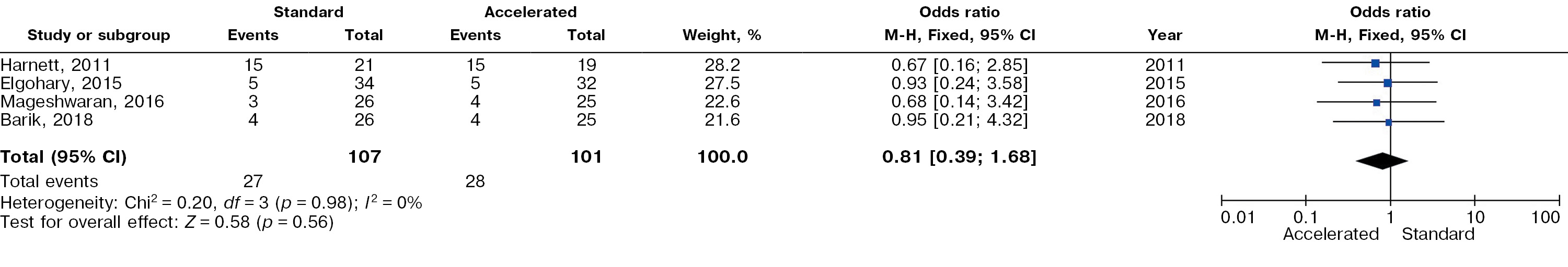 Before the hindfoot is corrected to a neutral position, if full dorsiflexion is not possible with stretching alone (for example, in cases of atypical clubfoot), a tenotomy is sometimes required to ‘unlock’ the os calcis from beneath the talus. In such cases, further stretching and casting are performed afterwards to achieve complete correction [15]. In their protocol, Mageshwaran et al. (2016) performed tenotomy when cavus, adductus, and varus were fully corrected but ankle dorsiflexion remained less than 10° above neutral after serial casting; before doing so, the authors made certain that abduction was adequate [6]. Even though Achilles tenotomy can be performed surgically or percutaneously, all studies included in this meta-analysis chose the latter option, which is superior to open surgery in preventing scarring due to its simpler and sutureless technique [16]. In our study, tenotomy rate between the two procedures does not differ significantly, though it is slightly higher in accelerated Ponseti method. This might be due to slightly higher initial Pirani score in accelerated group as mentioned by Mageshwaran et al. (2016) [6], as well as the difference in the severity of deformity or technical error in casting as mentioned by Elgohary et al. (2015) [5].