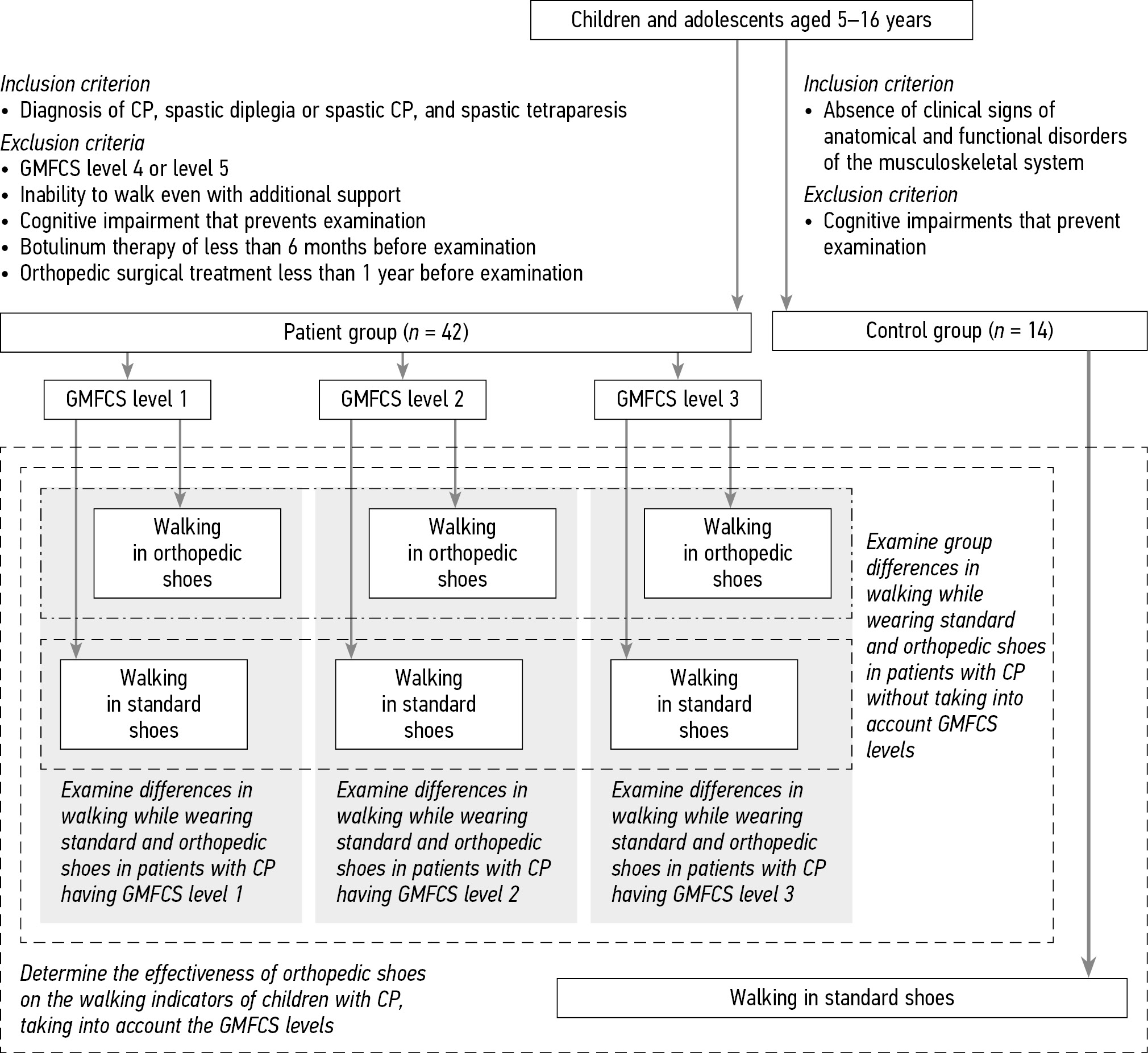 BACKGROUND: Clinical observations of patients with spastic forms of cerebral palsy and surveys showed the most commonly used technical rehabilitative device of this patient contingent are orthopedic shoes. However, almost no clinical and instrumental studies examine the effect of such shoes on the walking characteristics of patients with cerebral palsy (CP).