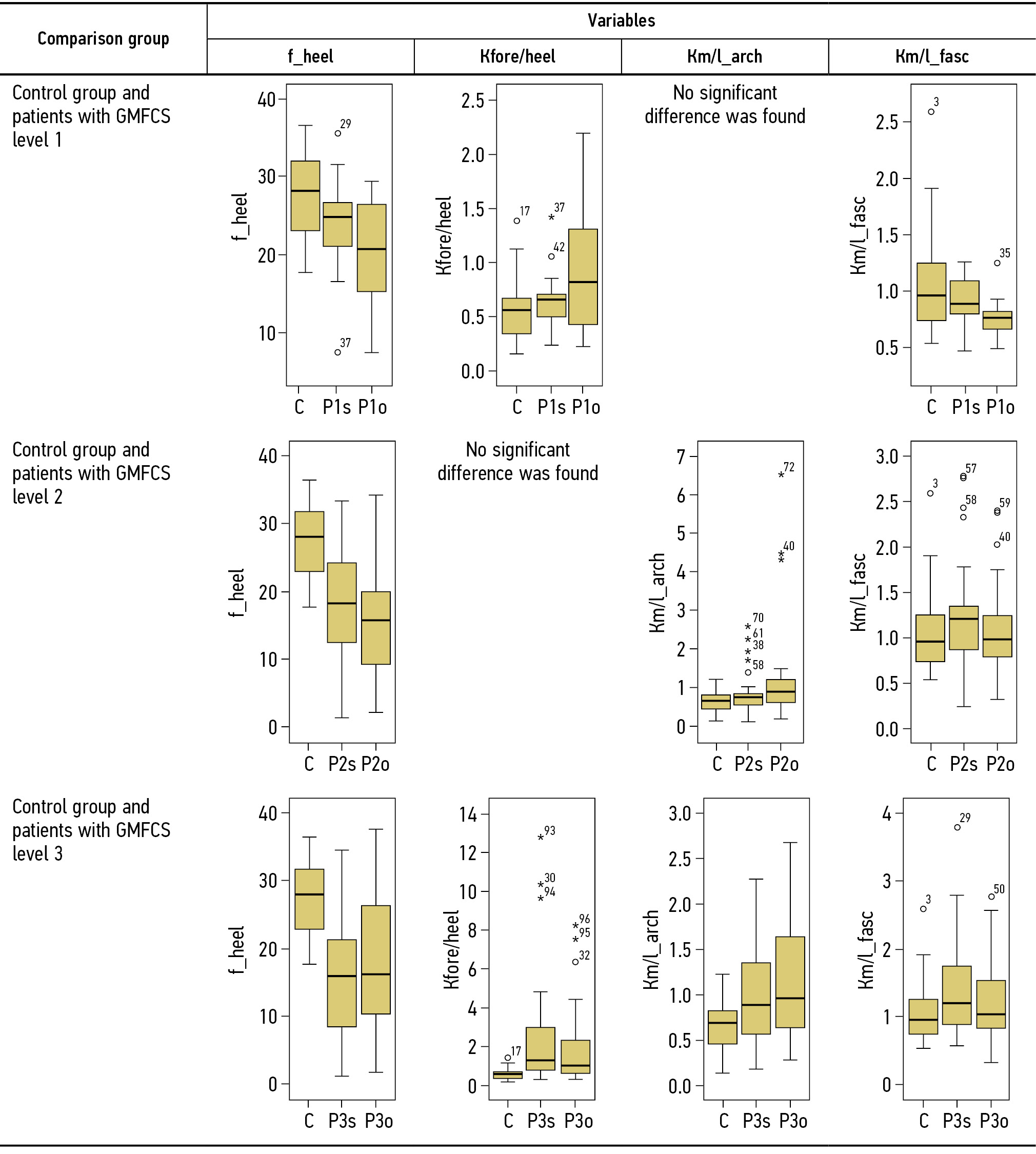 Note. Variables with significant differences are presented in bold typeface. P1, GMFCS 1 subgroup; P2, GMFCS 2; P3, GMFCS 3; o, orthopedic footwear; s, standard footwear.