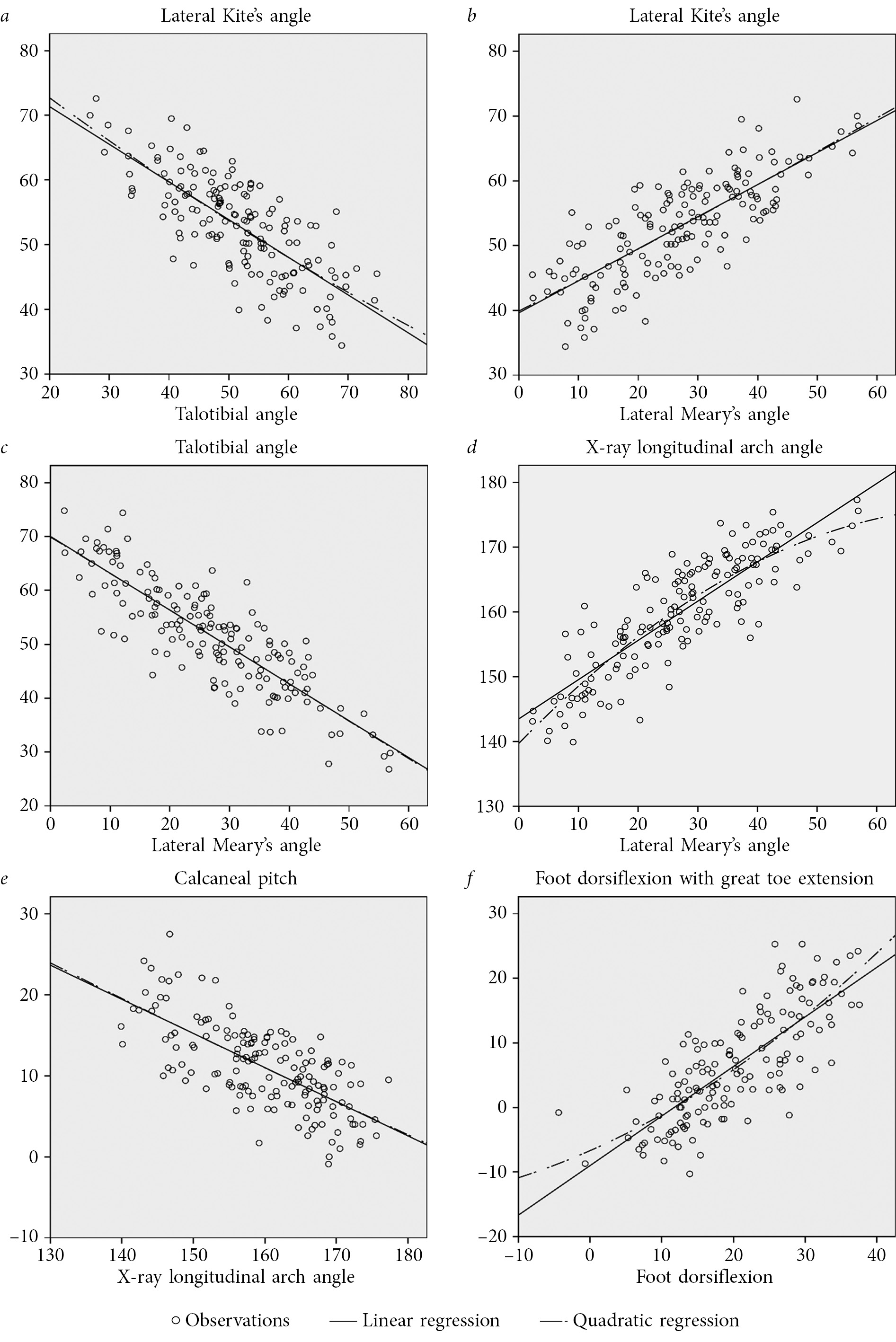 4. Fig. 3. Graphical representation of strong relations of clinical and radiological parameters of the feet in children with flatfeet according to the following pairs of criteria: a, b — lateral Kite’s angle — talotibial angle/lateral Meary’s angle; c, d — talotibial angle/X-ray longitudinal arch angle — talotibial angle; e — calcaneal pitch — X-ray longitudinal arch angle; f — foot dorsiflexion — foot dorsiflexion with great toe extension