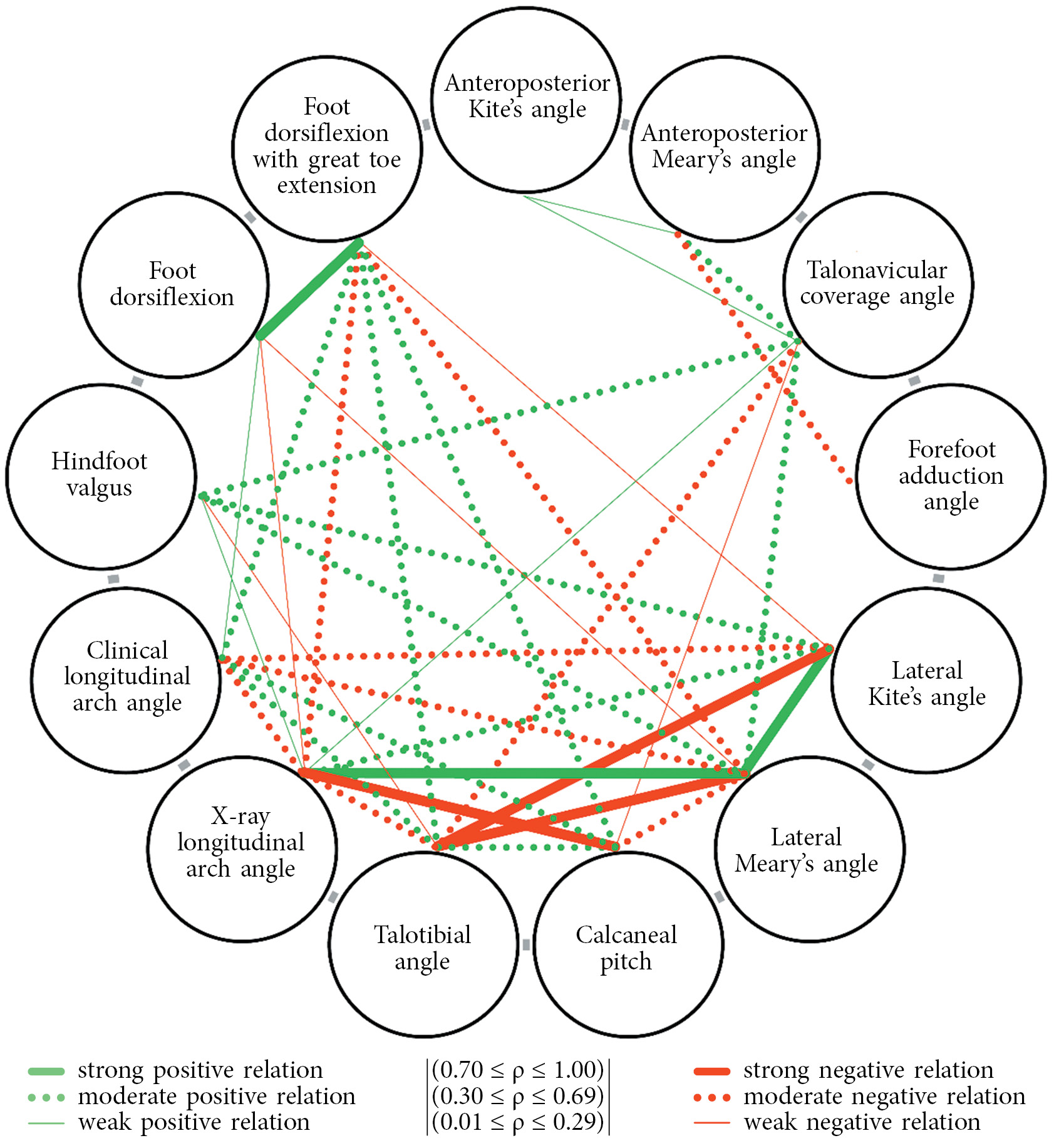 As seen from Fig. 4, strong correlations were found between radiological parameters on lateral X-ray images of the feet. It is also possible that a strong relationship exists between the degree of foot dorsiflexion in different test variants. Foot dorsiflexion with great toe extension and clinical longitudinal arch angle were characterized by moderate relationships with radiological parameters of the feet in the sagittal view. On the other hand, the hindfoot valgus had only three moderate relationships with the talonavicular coverage angle, lateral Meary’s angle, and lateral Kite’s angle. The remaining relationships between the hindfoot valgus and clinical and radiological parameters were weak. X-ray parameters on anteroposterior X-ray images characterizing the severity of deformity (anteroposterior Meary’s angle, anteroposterior Kite’s angle, talonavicular coverage angle) had the least number of correlations with other parameters and only one moderate relationship with clinical parameters (talonavicular coverage angle — hindfoot valgus).