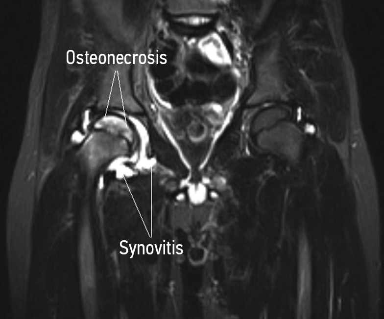 Fig. 1. Magnetic resonance imaging shows the initial stage of ANFH (from the author’s archive). A magnetic resonance imaging scan reveals osteonecrosis of the femoral head on the right, massive trabecular edema, as well as pronounced symptoms of synovitis with overstretching of the joint capsule