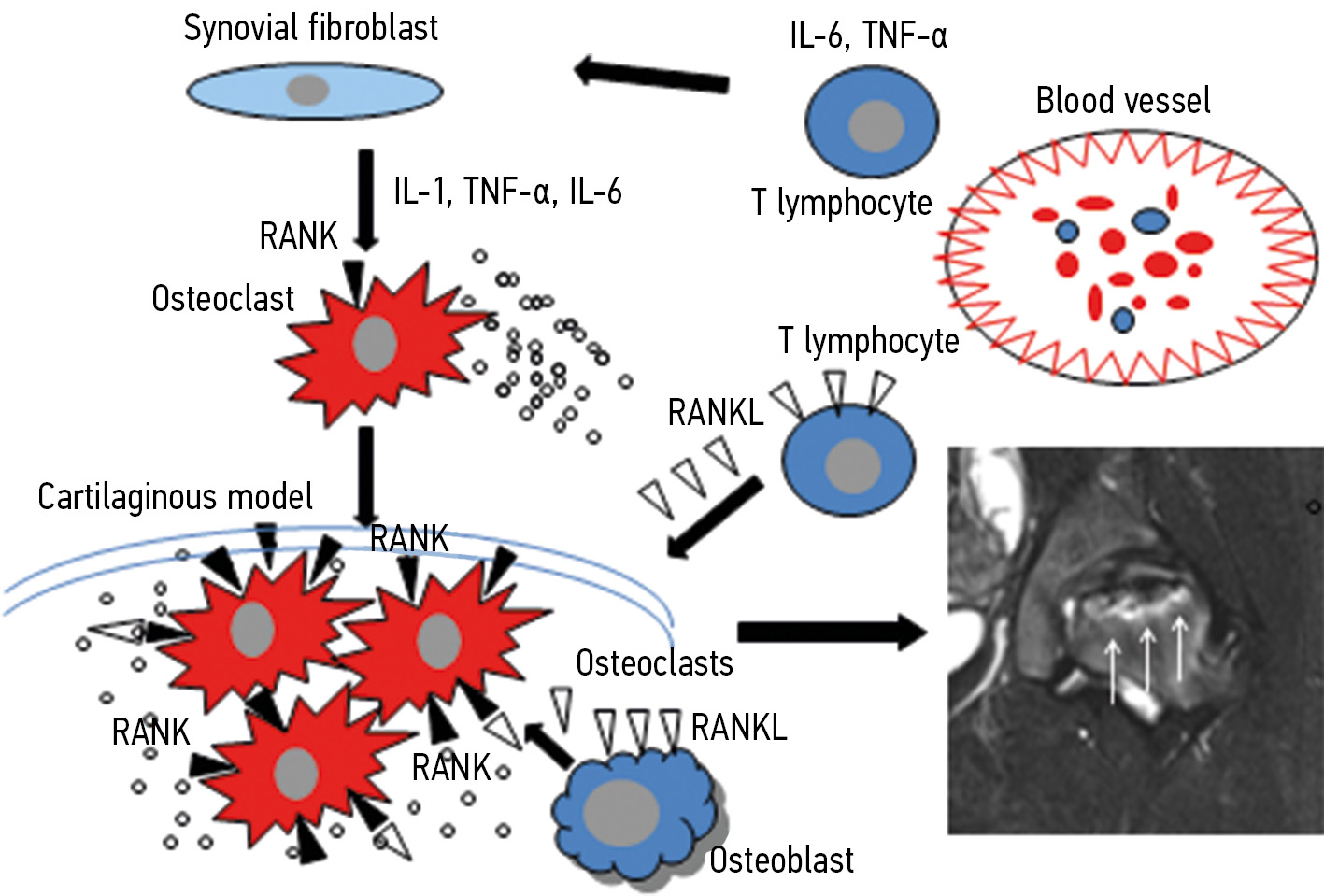 Fig. 2. Scheme of osteoclast activation in the focus of osteonecrosis (from the author’s archive). Explanation is presented in the text. RANK, cellular receptor activator; RANKL, receptor ligand; IL-6, interleukin-6; IL-1, interleukin-1, TNF-α, tumor necrosis factor alpha