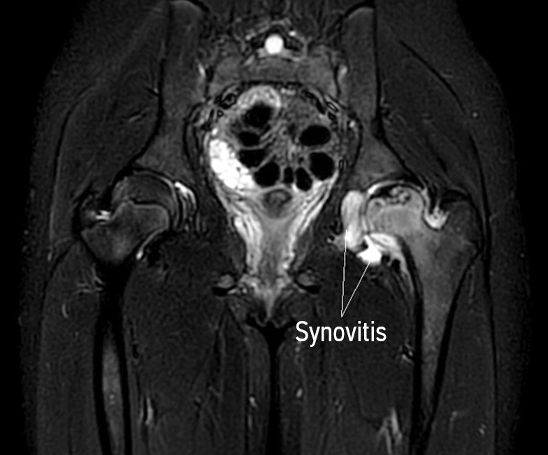 Fig. 3. Magnetic resonance imaging shows stage 2 of osteochondropathy of the femoral head on the left with signs of osteoarthritis (from the author’s archive). Magnetic resonance imaging in T2 STIR modes reveals an extensive area of femoral head destruction, signs of trabecular edema, and chronic synovitis