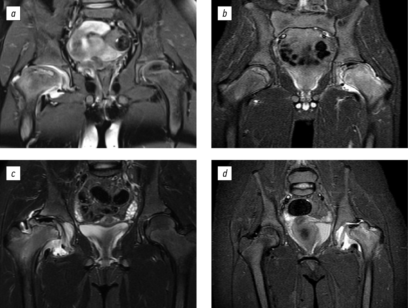 Fig. 4. A series of magnetic resonance imaging in pediatric patients with LCPD with signs of osteoarthritis: (a, b) without subluxation in the affected joint; (c, d) with subluxation of the femoral head (from the author’s archive)