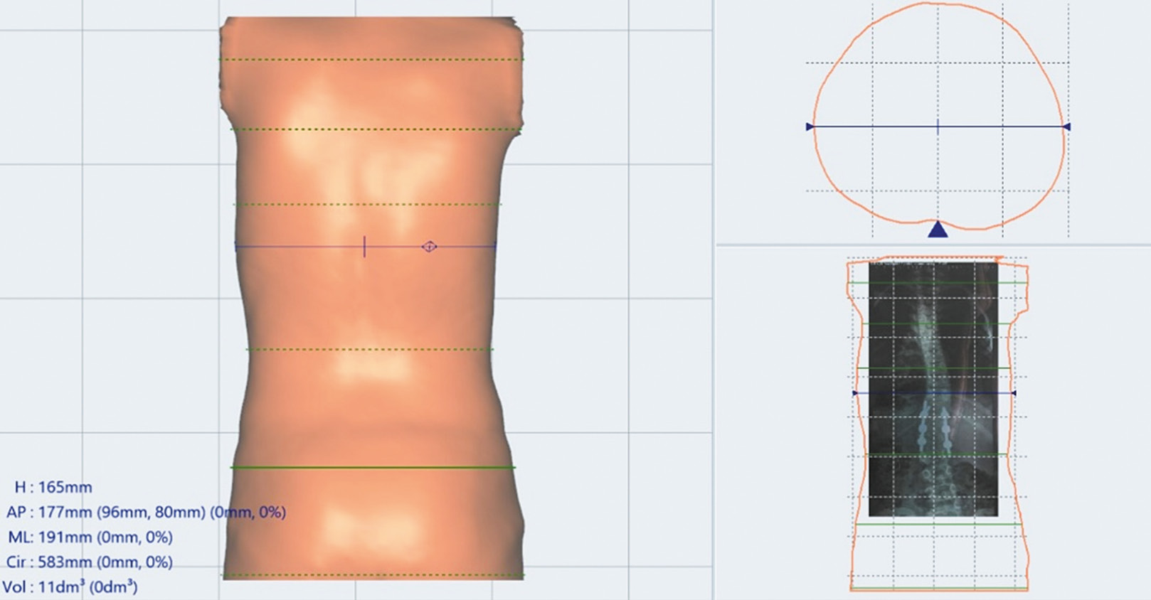 «Слепки» с туловища пациента снимали по технологии цифрового 3D-сканирования. Преимуществами такой технологии у послеоперационных больных являются быстрота и бесконтактность метода. При этом прежде всего отсутствует механическое воздействие на туловище, которое наблюдается при «классическом» снятии слепка при помощи гипсовых бинтов. Кроме того, значительно сокращается время нахождения пациента в вертикальном положении, а при необходимости скан туловища можно сделать и в положении лежа. Полученный скан туловища, а также рентгенограмму позвоночника после оперативного лечения (рис. 1) загружали в программный комплекс Rodin4D (Франция).