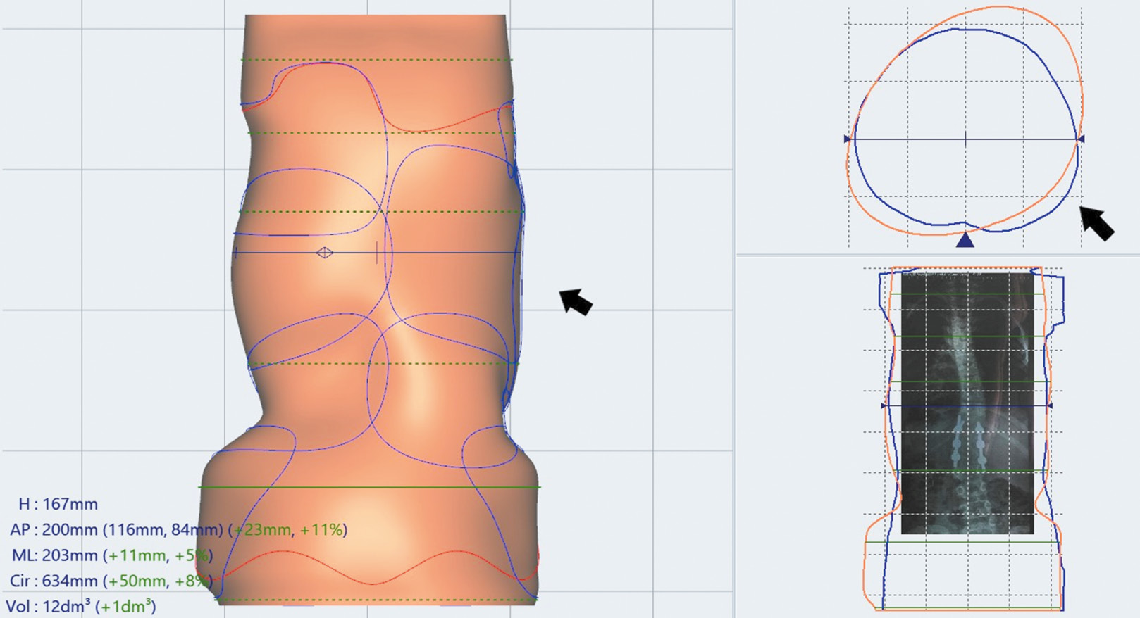 Рис. 2. Законченное моделирование функционально-корригирующего ортеза на туловище при грудной компенсаторной противодуге. На дорзальной плоскости слева стрелкой указан пелот, корригирующий грудной гибус. На фронтальном срезе справа стрелкой также указан корригирующий пелот. Границы корсета представлены оранжевым контуром, тело — синим