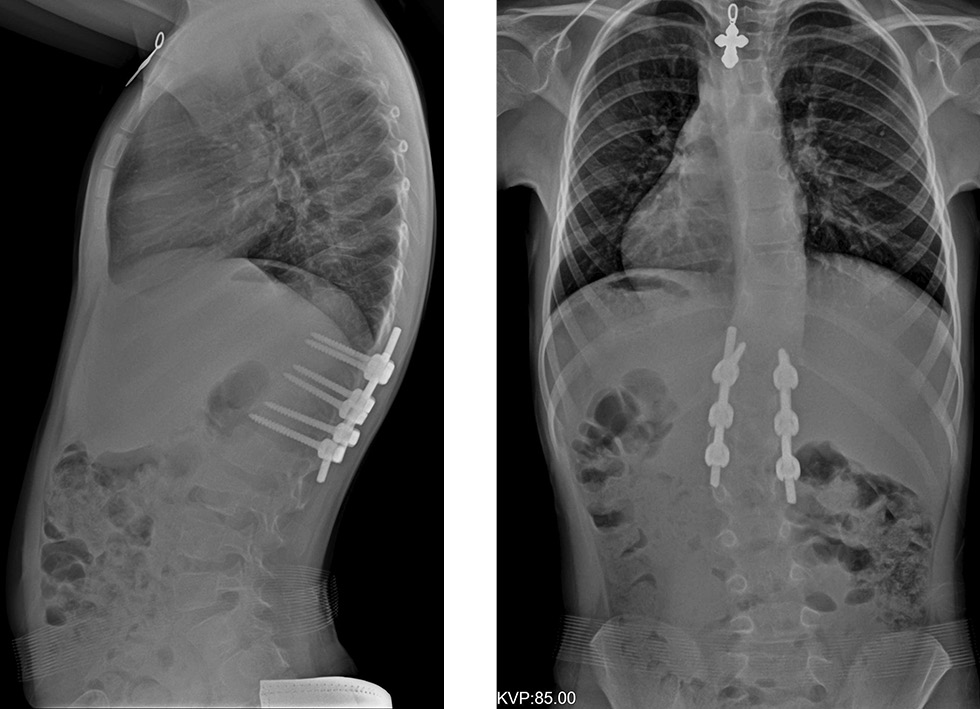 На рентгенограммах после оперативного лечения отмечалась радикальная коррекция локальной врожденной деформации позвоночника грудного отдела, положение металлоконструкции правильное, стабильное. Правосторонняя компенсаторная сколиотическая противодуга на уровне позвонков Th11–Th7 величиной 18°.