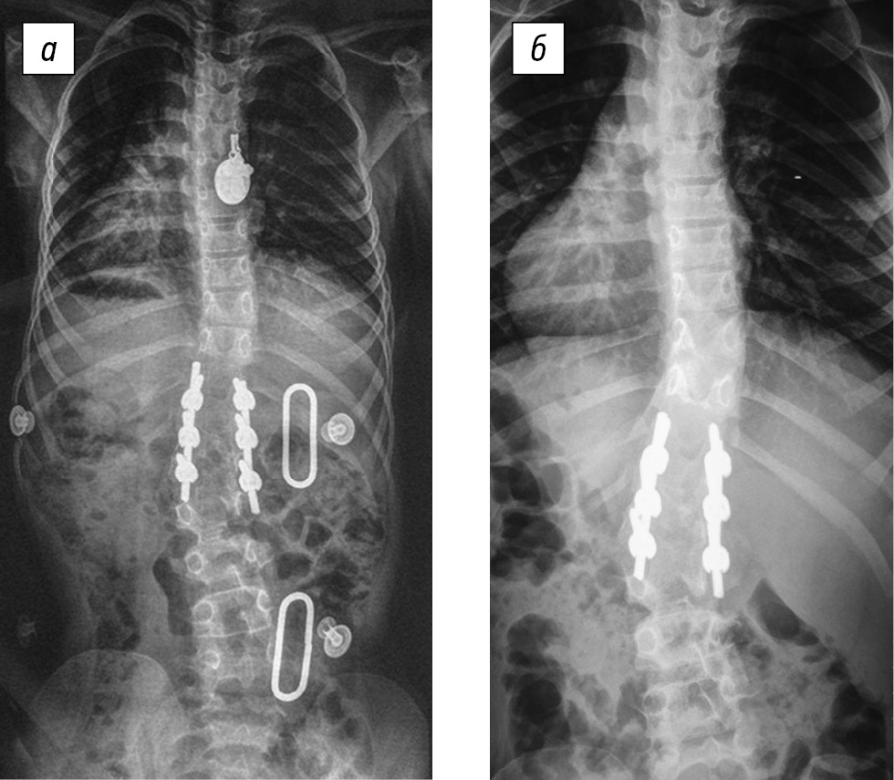 Результаты ортезирования демонстрирует рис. 5. На рентгенограммах через 6 мес. в функционально-корригирующем корсете положение металлоконструкции в грудном отделе стабильное, произошла коррекция правосторонней компенсаторной противодуги на уровне позвонков Th11–Th7 до величины 6°.