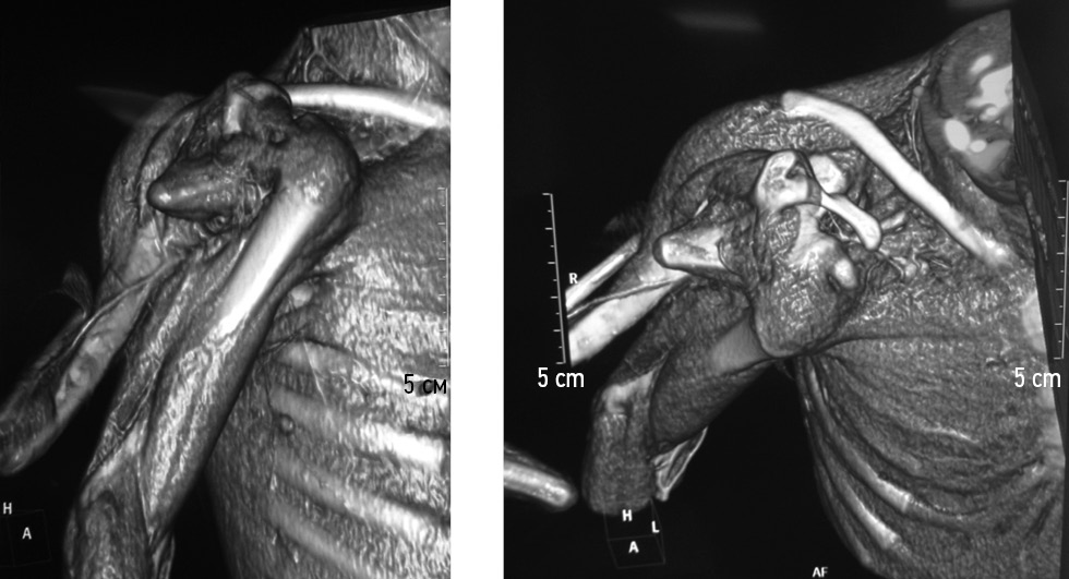 Clinical examination revealed no pathological changes in the internal organs, lower limbs, chest, spine, and head. The left upper limb was also normally developed, and no pathological changes were detected. On the right limb, a significant increase in the volume of the shoulder girdle and upper limb was noted. Upon palpation, two shoulder blades, two humerus bones, and forearm bones were identified. The limbs along their entire length were fused with soft tissues and were in the sagittal plane in relation to each other; therefore, the posteriorly located limb was called posterior (main) and the anteriorly located one anterior (additional). The “posterior” upper limb was normally developed in the proximal part, and the scapula was of normal shape, with correct anatomical localization and articulated with a normally developed and correctly positioned clavicle. The humerus was articulating with the scapula at the shoulder joint, which was 2 cm shorter than the left humerus. At the elbow joint, the “posterior” upper limb articulated with the shortened ulna, which was the stump of the underdeveloped forearm. Here, the elbow joint was in a state of flexion contracture at an angle of 170°, and the ulna was located posteriorly and 15°–20° inwards. In this elbow joint, rocking passive movements were determined (within 10°–15°), and no hand was found on the “posterior” limb.