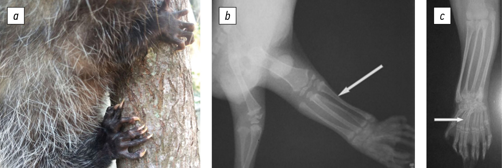 Fig. 9. Duplication of the hind limb in an opossum: a, appearance; b and c, radiographs