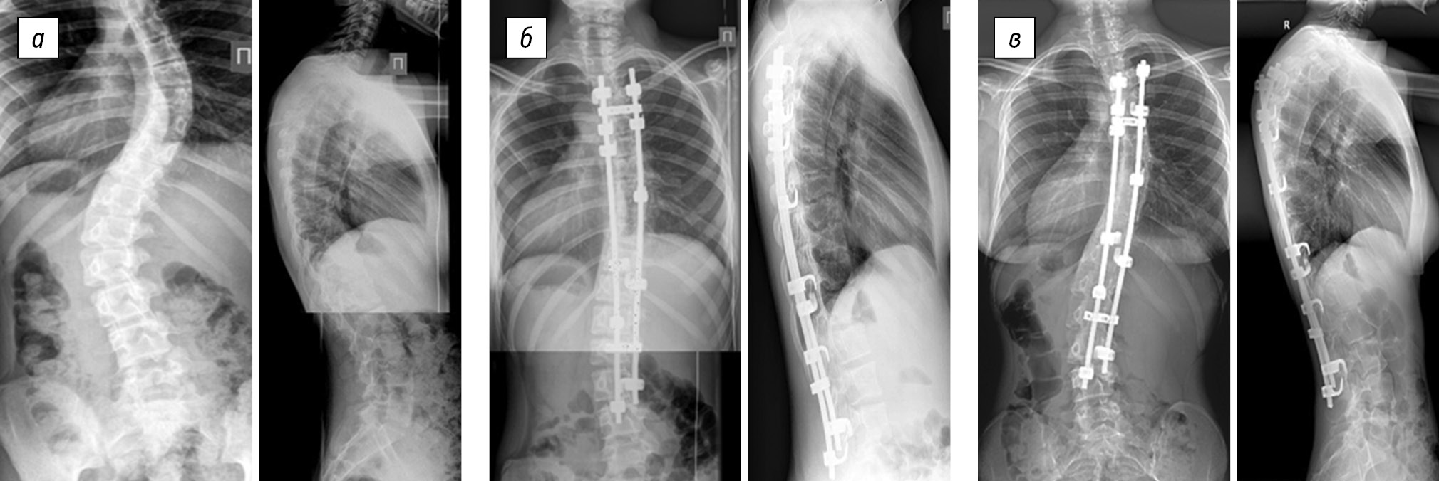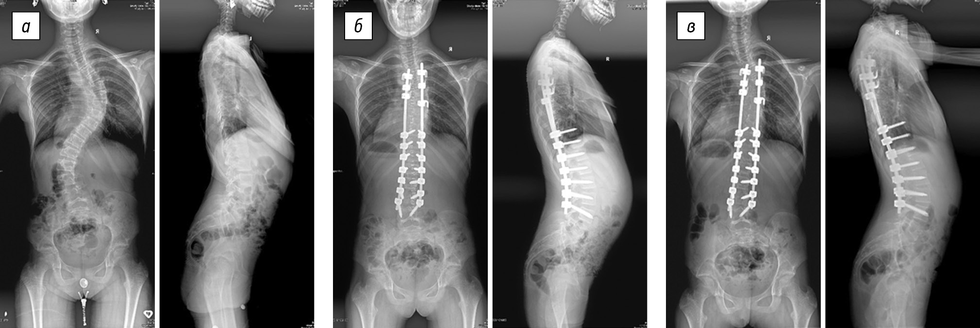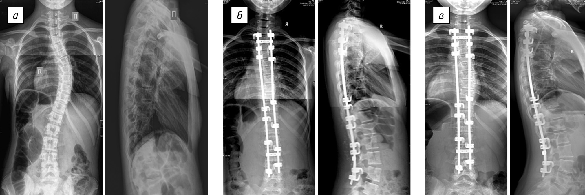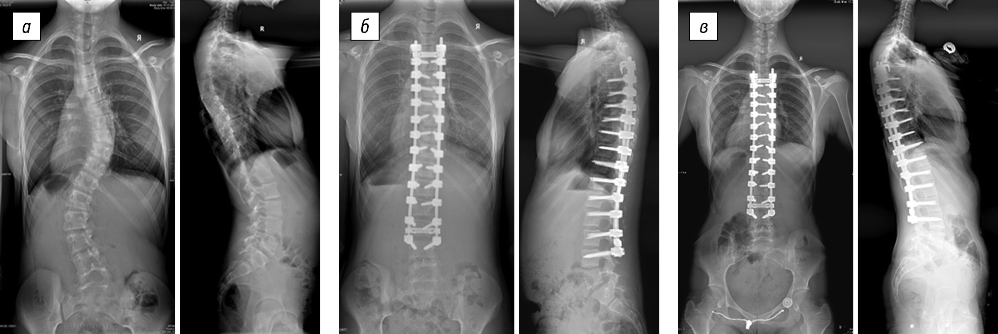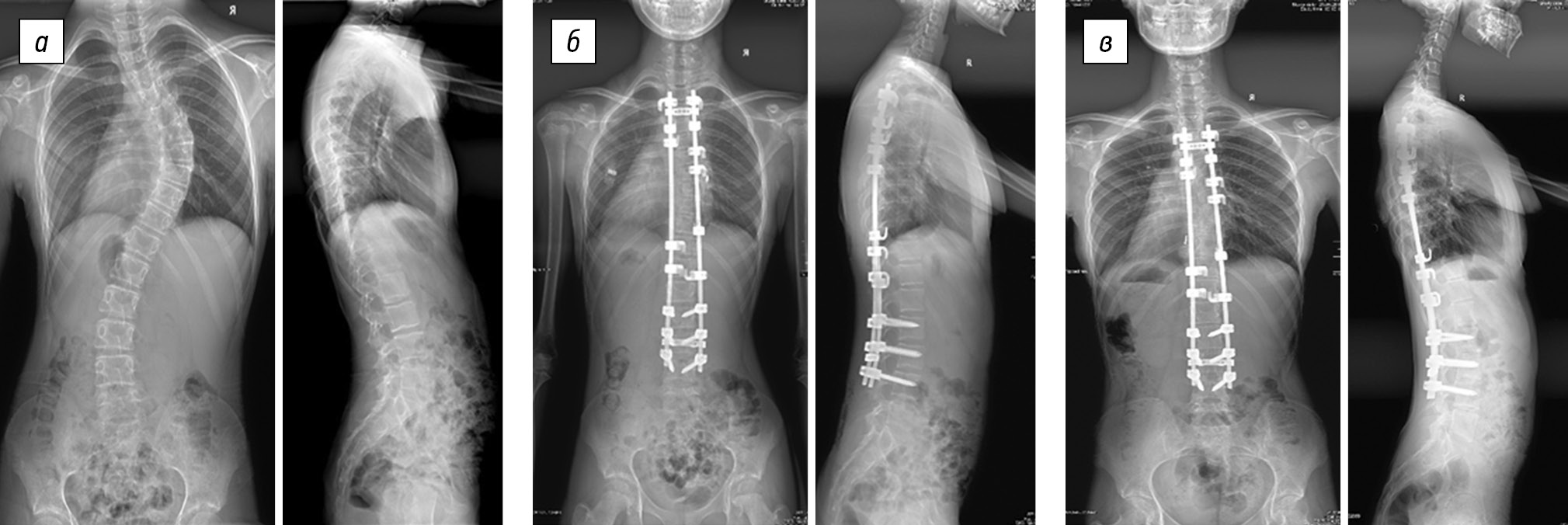 Fig. 5. Radiographs of a 13-year-old female patient in two views: a — preoperative image of degree IV right-sided thoracic scoliotic deformity (51° according to Cobb) with lumbar anti-curvature (49°), thoracic kyphosis of 62°, and lumbar lordosis of 59°; b — surgical correction of scoliotic deformity of the spine using laminar fixation in combination with mobilizing discectomy at the levels of Th5–Th6, Th6–Th7, Th7–Th8, and Th8–Th9 results in main thoracic curve of 24°, lumbar anti-curvature of 20°, thoracic kyphosis of 40°, and lumbar lordosis of 46°; c — X-ray control 6 years after surgery revealed the main thoracic curve of 35°, lumbar anti-curvature of 34°, thoracic kyphosis of 51°, and lumbar lordosis of 57°