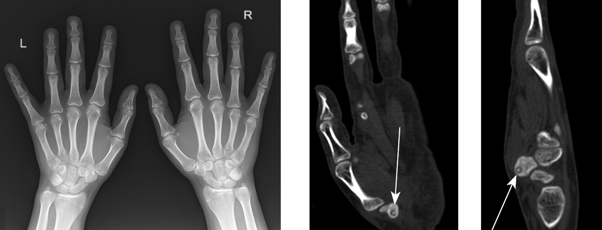 Fig. 2. Patient P, 17 years old. X-ray of the hands in anteroposterior projection and computed tomography of the left hand in MPR mode (frontal and sagittal planes) demonstrating the localization of the tumor nest (arrows)