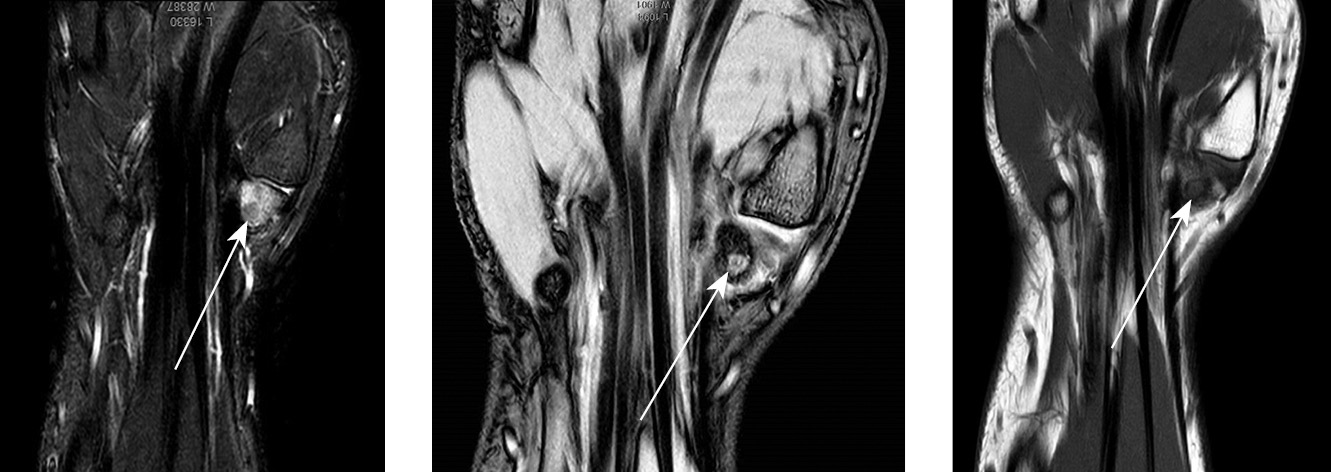 MRI showed diffuse trabecular edema of the trapezium bone of the left hand, with an ovoid osteolytic mass of 5 mm in diameter on the palmar surface of the tubercle. PD SPAIR revealed a hyperintense MR signal, whereas T1WI showed an isohypointense signal. The structure of the tubercle of the trapezium bone on the palmar surface revealed an ovoid osteolytic mass 5 mm in diameter, with clear contours, surrounded by a weakly expressed rim of osteosclerosis around the periphery. This pathological formation was mainly characterized by an isohypointense signal on T1WI and PD SPAIR. Additionally, moderately pronounced edema was observed in the paraossal soft tissues of the left hand in the corresponding location (Fig. 3).