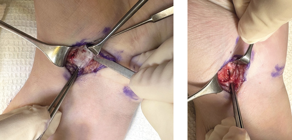 Fig. 4. Patient P, 17 years old. Intraoperative image: a, after subcutaneous isolation of the palmar/volar surface of the trapezium bone; b, after resection of the tumor “nest” within healthy tissues