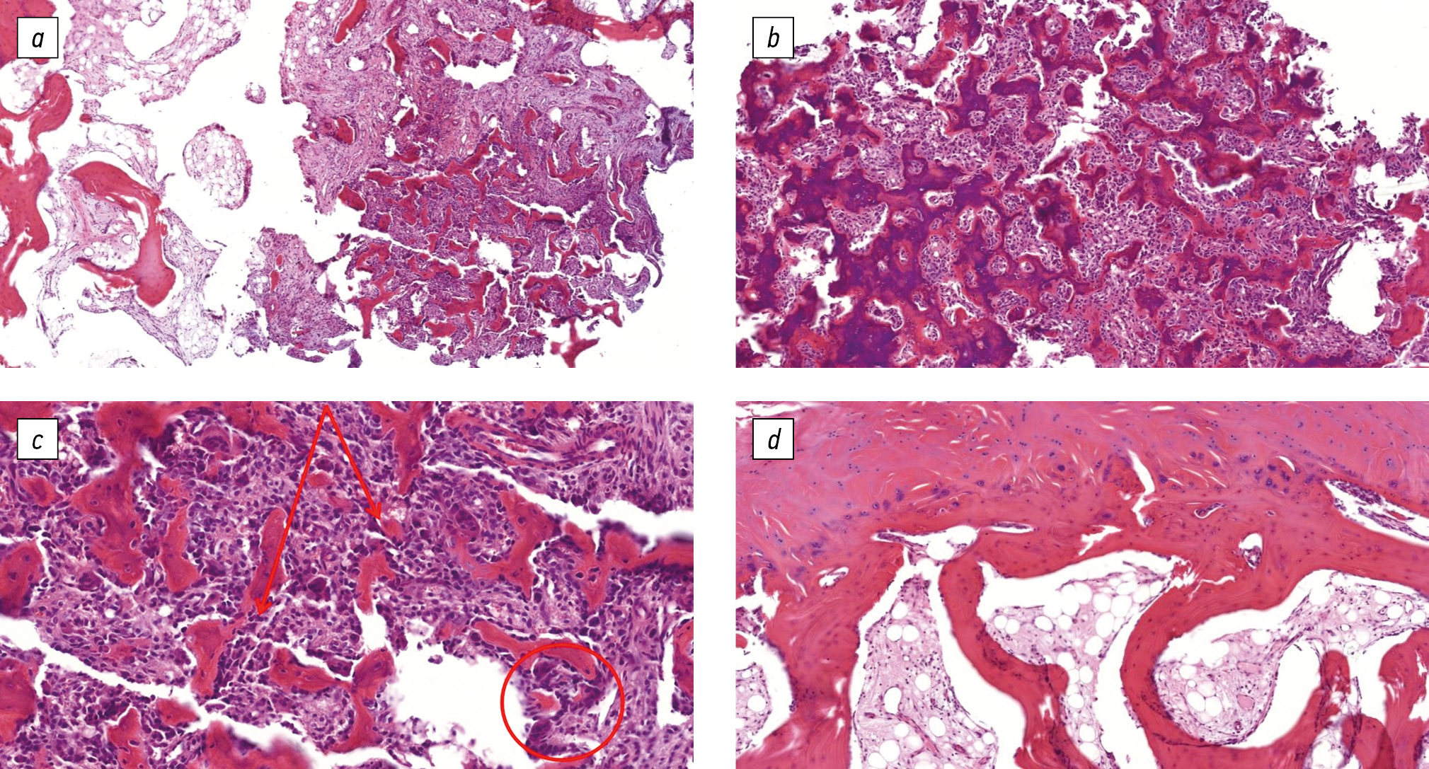 Fig. 5. Patient P, 17 years old. Microphotographs at histological examination: a, overview microphotograph showing a section of the tumor nidus bordering adjacent bone tissue, staining with hematoxylin and eosin, ×50; b, fragment of the nidus represented by moderately calcified bone beams with cellular fibrous connective tissue in the intertrabecular spaces, staining with hematoxylin and eosin, ×100; c, focal osteoclastic reaction with some large multinucleated cells of osteoclastic type, staining with hematoxylin and eosin, ×200; d, thickened bone beams bordering with sclerosed connective tissue fibers of the periosteum, staining with hematoxylin and eosin, ×100
