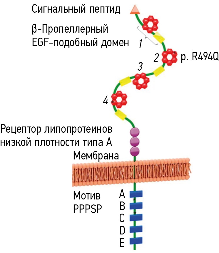 Рис. 6. Схематическое представление структуры и доменной организации белка LRP5. Локализация аминокислотной замены во втором β-пропеллерном домене белка LRP5 у сибсов с синдромом «остеопороз-псевдоглиома»