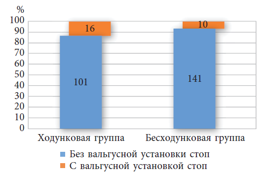 The diagram shows the prevalence of this pathology in the “walker” group. To verify the statistical reliability of the connection of these phenomena, we constructed a four-field table (Table 5).